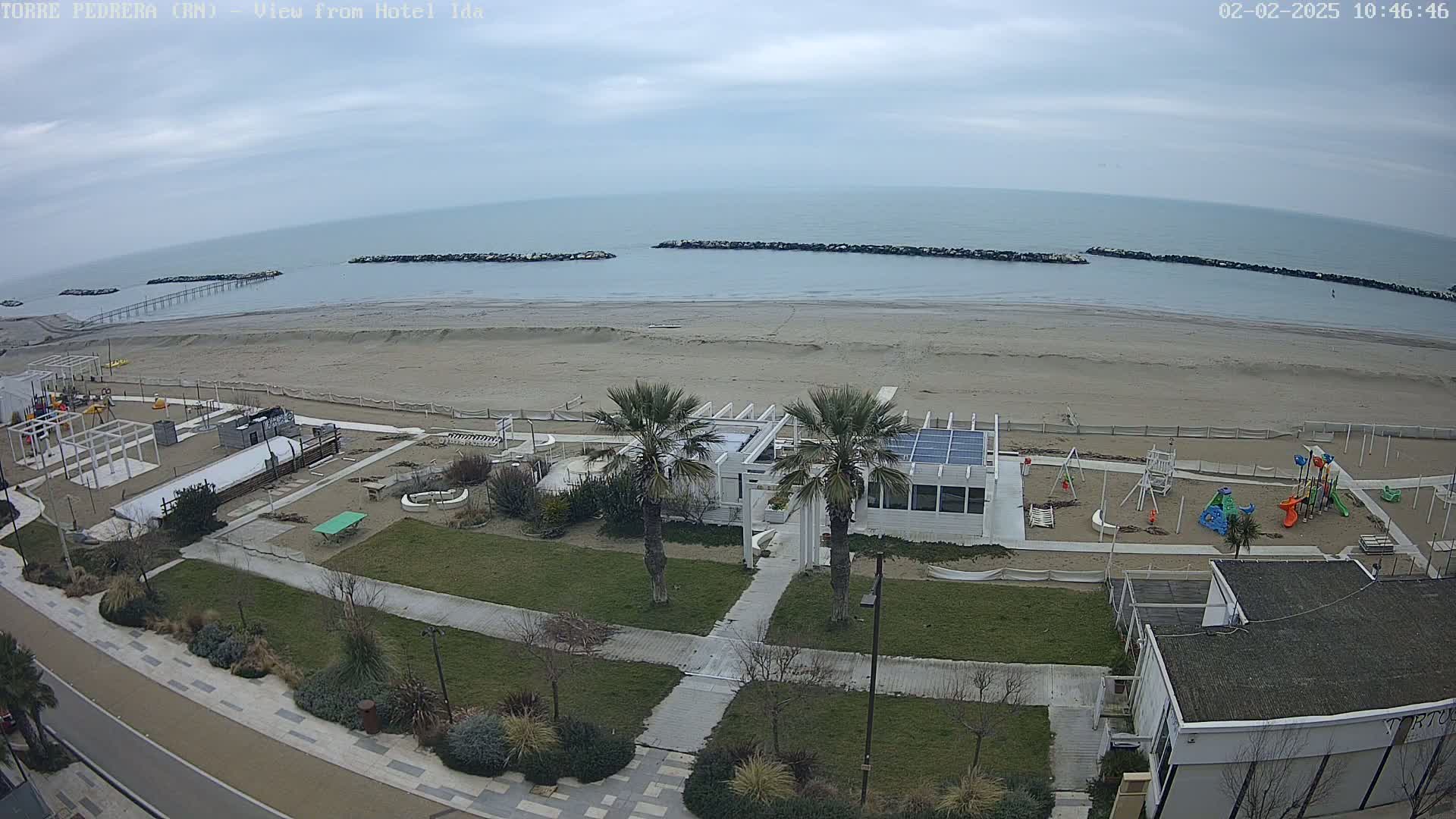 An aerial view of a beach with calm water under an overcast sky shows rows of beach umbrellas and chairs, a playground, and several buildings near the shoreline.