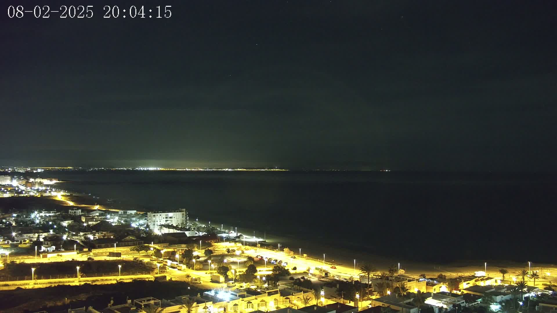 A nighttime coastal scene shows a dark ocean, a beach with illuminated buildings and streets along the shore under a clear, dark sky.