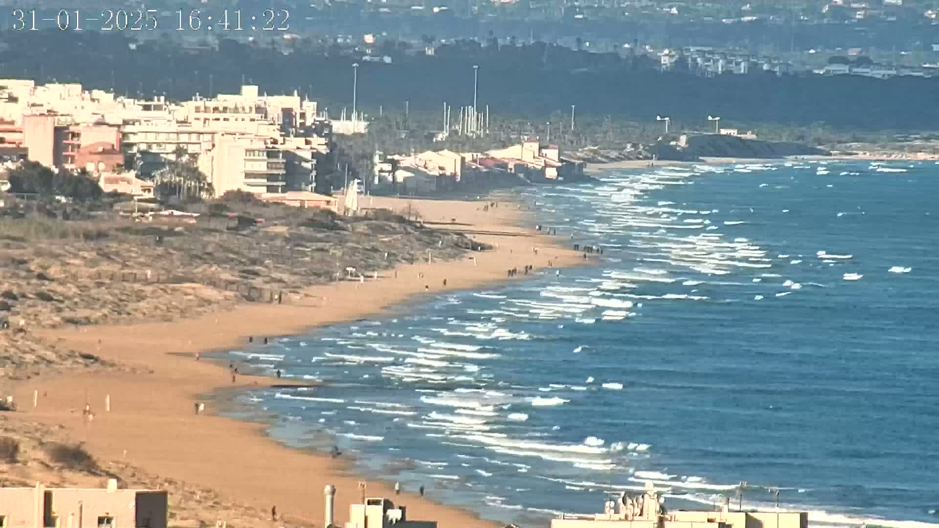 A sandy beach with gentle waves and wooden walkways is seen from an elevated vantage point, overlooking a calm sea under a mostly clear sky.