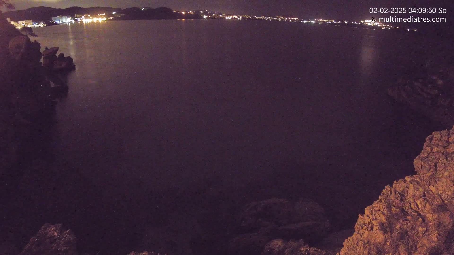 A nighttime view shows a dark body of water reflecting the lights of a distant town, with a rocky outcrop visible in the bottom right corner.