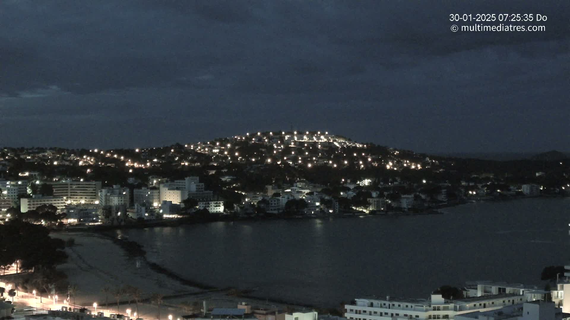 A nighttime view of a coastal town illuminated by many lights, with a dark body of water in front and a hill rising behind it.