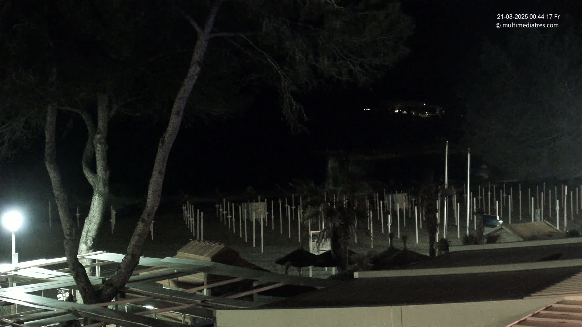 A sunny beach with numerous thatched umbrellas and lounge chairs, a boat in the turquoise water, and pine trees in the foreground.