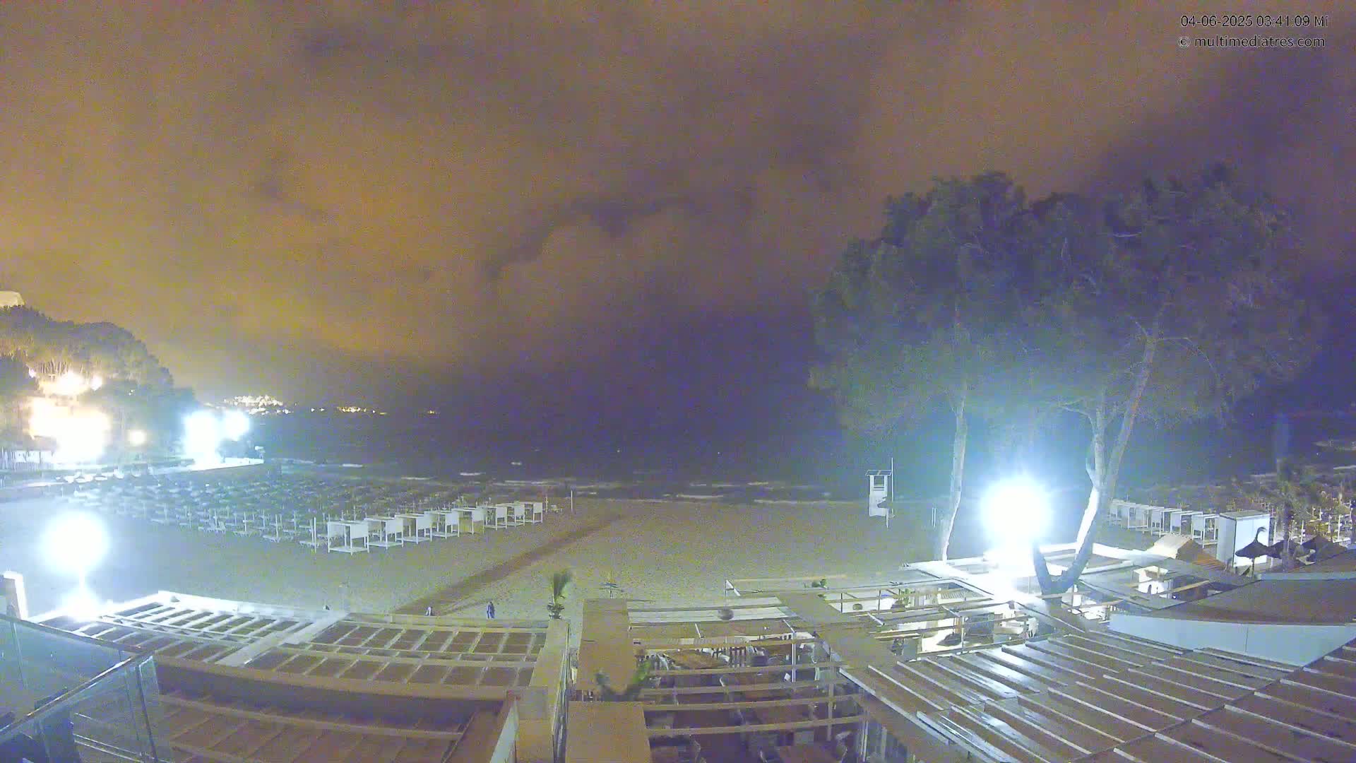 A nighttime view of a beach or coastline shows breaking waves under a partly cloudy sky, with bright artificial lights illuminating the sandy shore, foreground structures, and a distant town across the water.