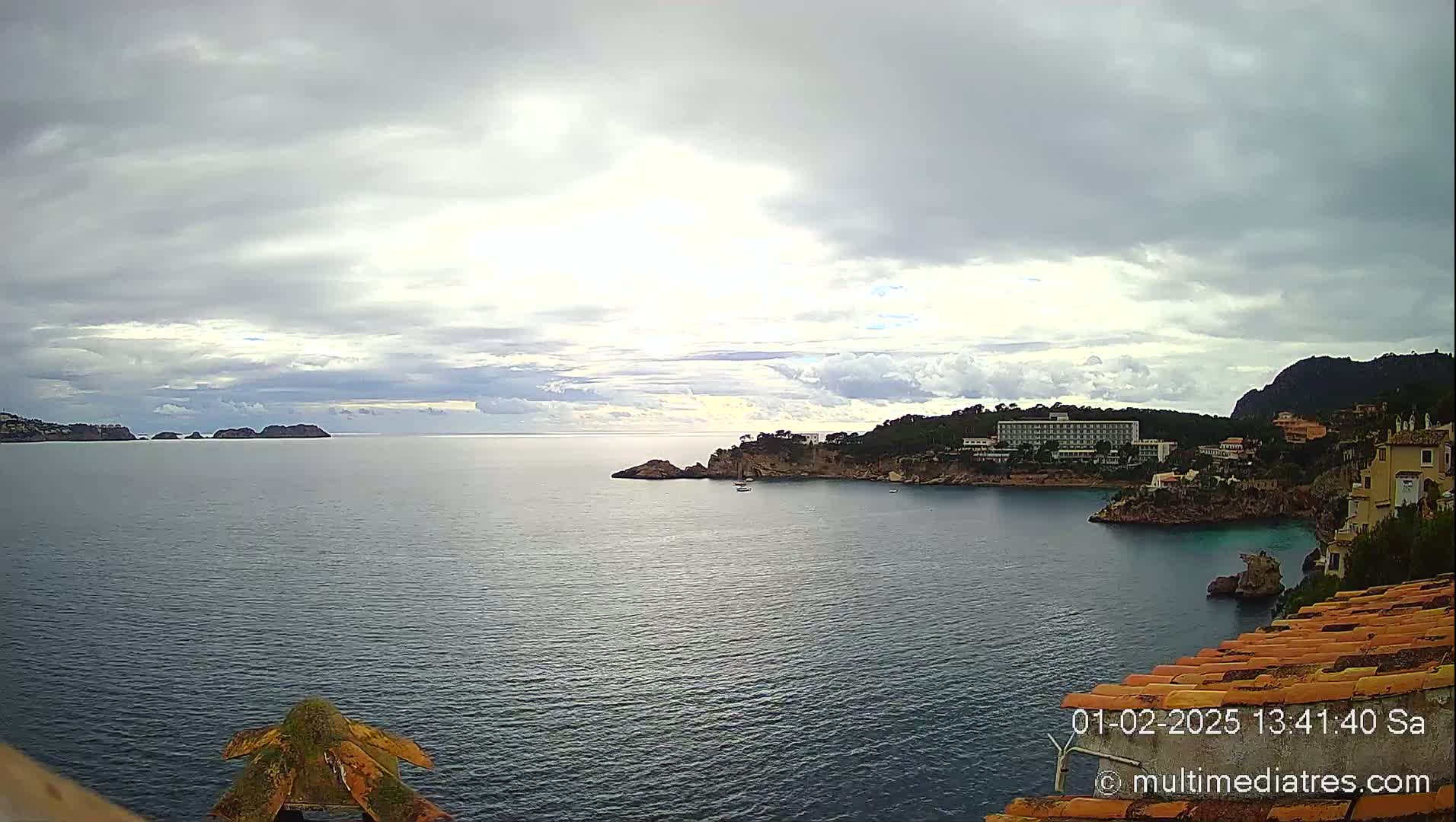 A partly cloudy day shows a coastal scene with a sailboat and a boat, calm water, rocky coastlines, and buildings nestled among the trees.
