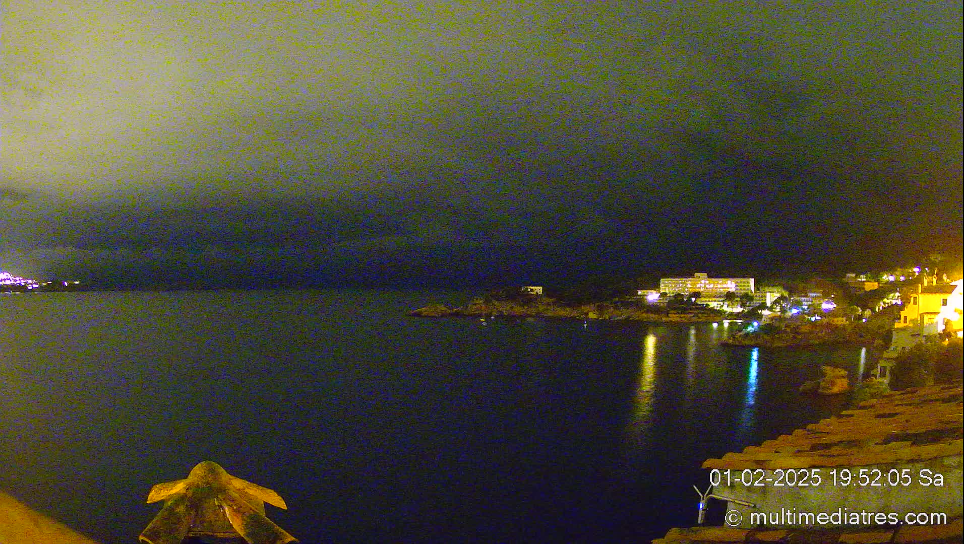 A partly cloudy day reveals a coastal scene with calm blue water, a few boats, rocky shorelines, buildings nestled on a hillside, and small islands in the distance.