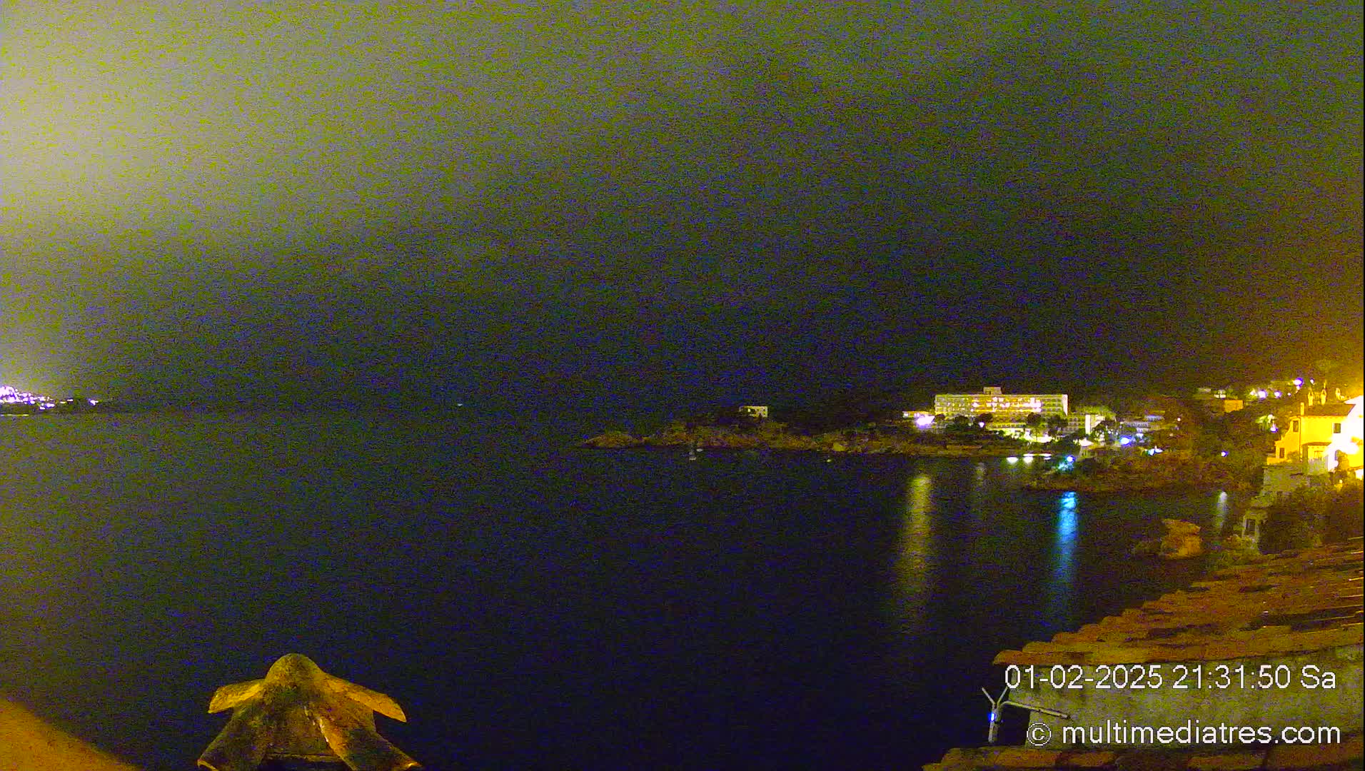A nighttime view of a calm body of water with a sailboat and other boats at anchor near a lit-up shoreline under a dark, cloudy sky.