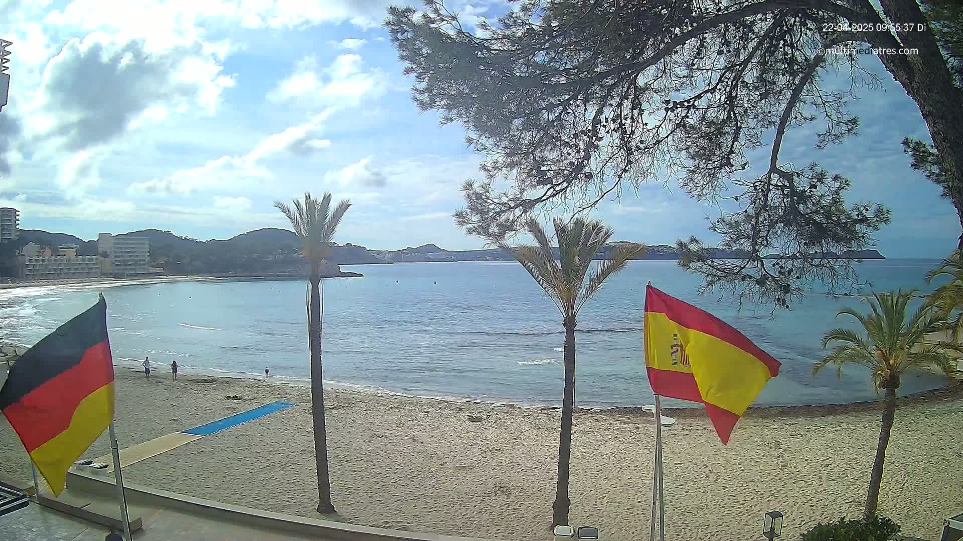 A sunny day with scattered clouds lights up a sandy beach with palm trees and a German and Spanish flag, overlooking a bay with gentle waves and distant coastal buildings and hills.