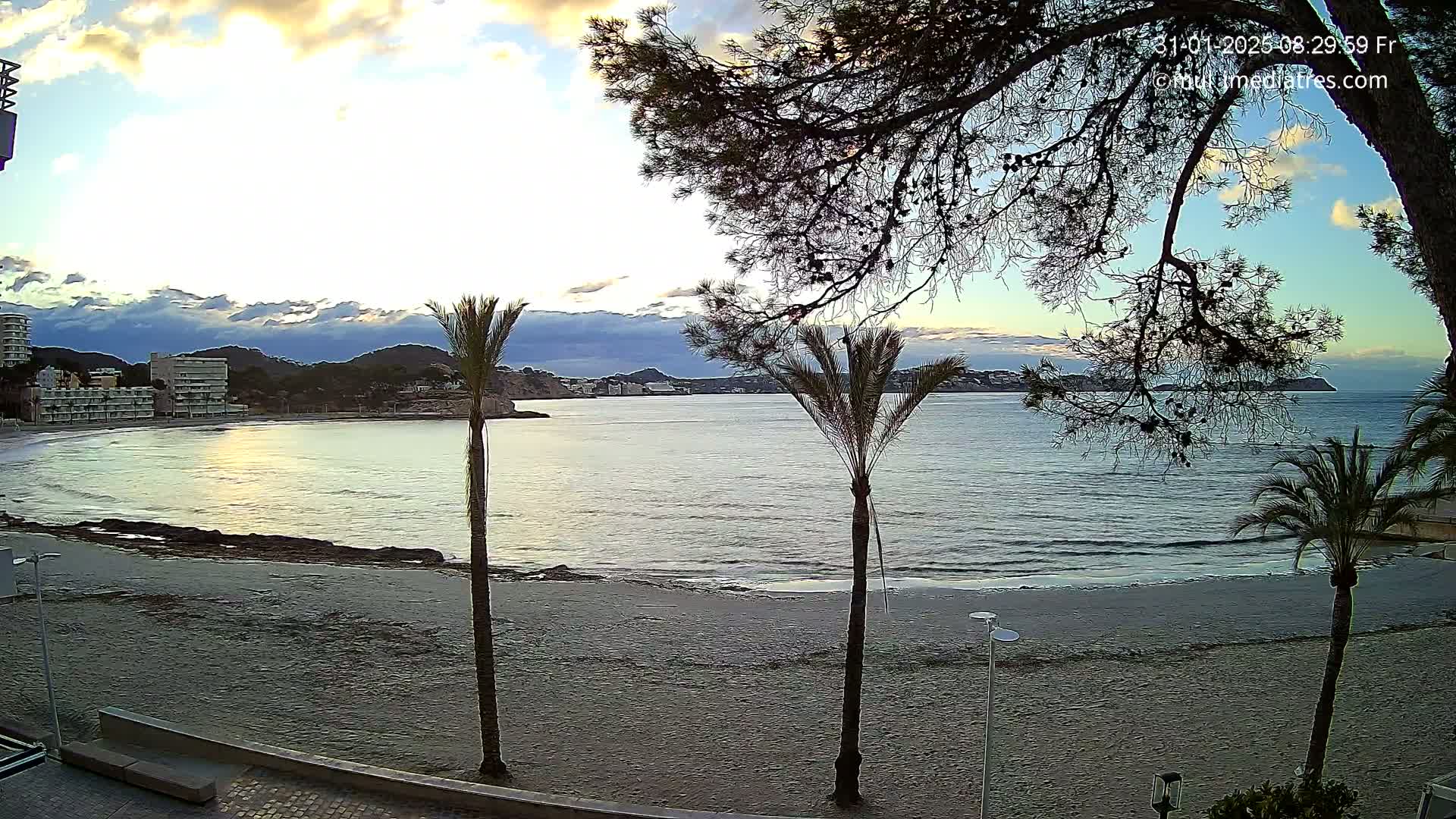 A sandy beach with calm waves and several palm trees, overlooking a calm sea and buildings under a partly cloudy sky.