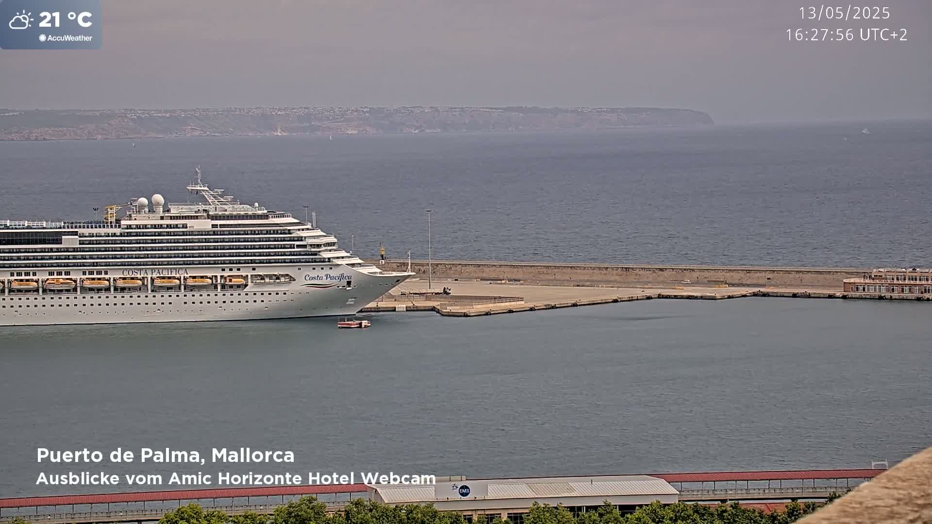 A large cruise ship is docked at a port, with calm water and a distant coastline visible under a hazy sky.