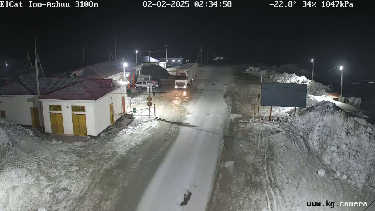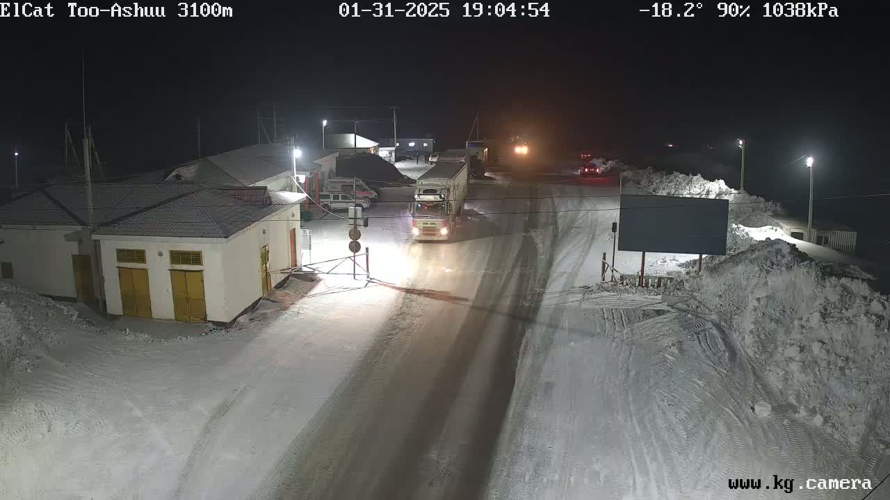 A snow-covered mountain pass with several vehicles near a checkpoint building and a large warehouse, under cloudy skies and a temperature of -19.1°C.