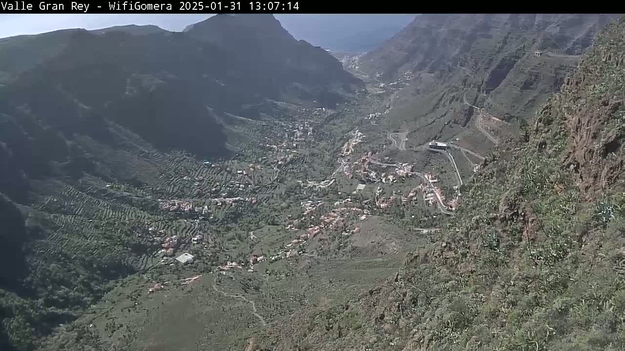 A high-angle, sunny view shows a town nestled in a steep, mountainous valley with winding roads and terraced farmland.