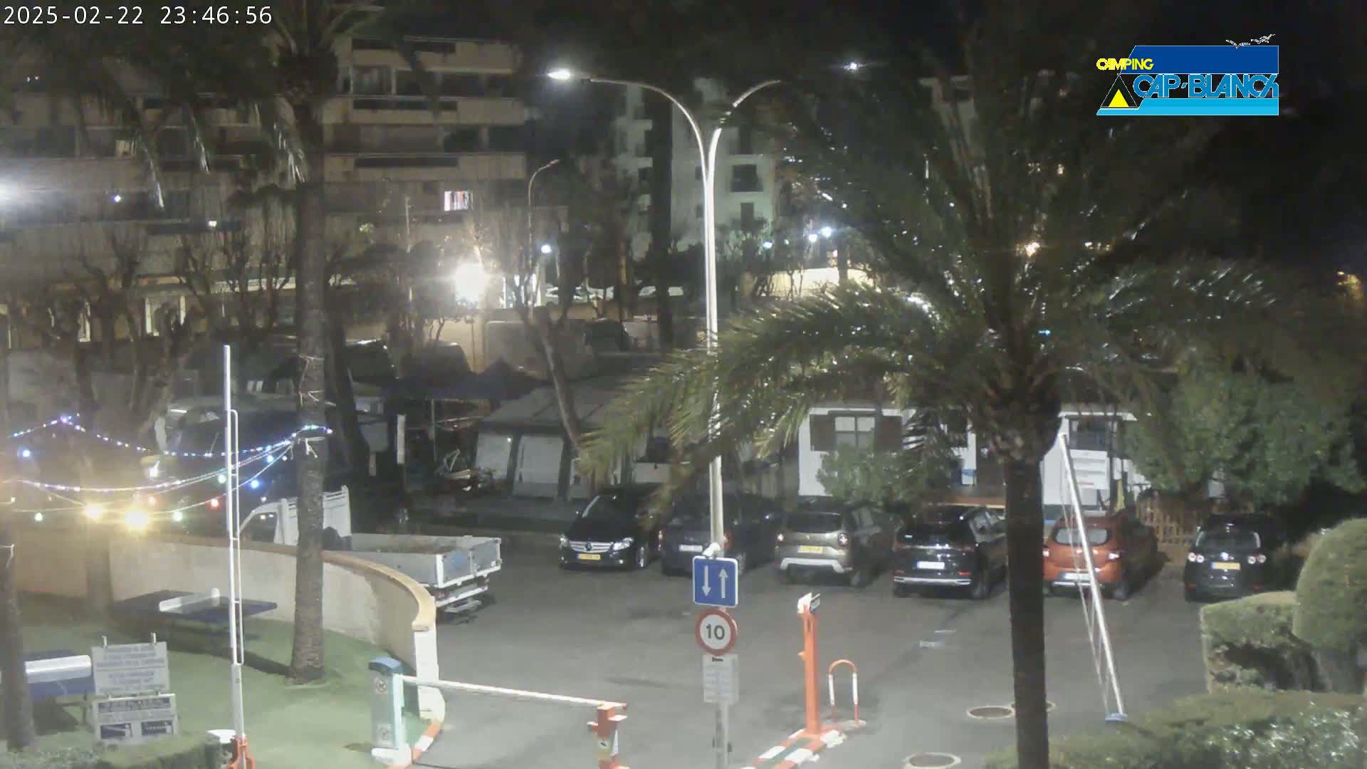 A sunny parking lot with several cars and palm trees, located near buildings and what appears to be a campsite.