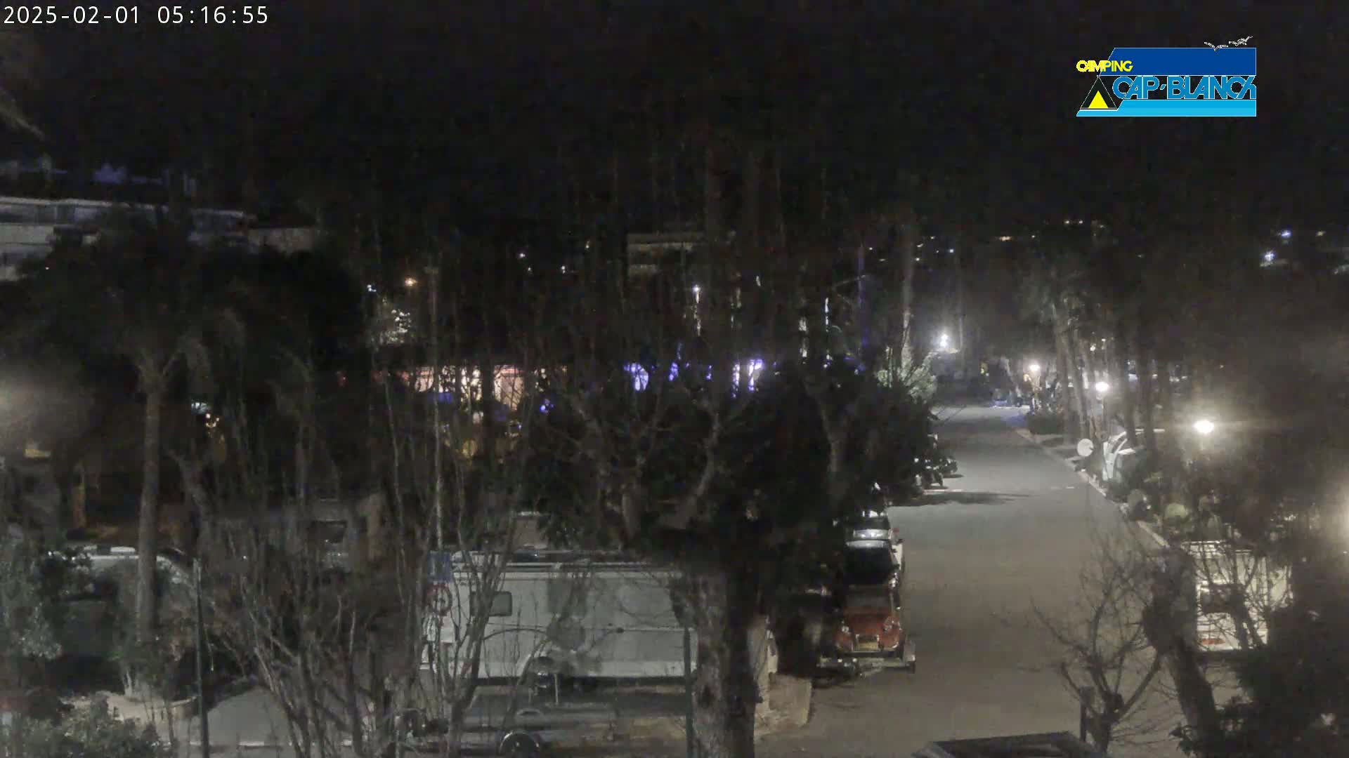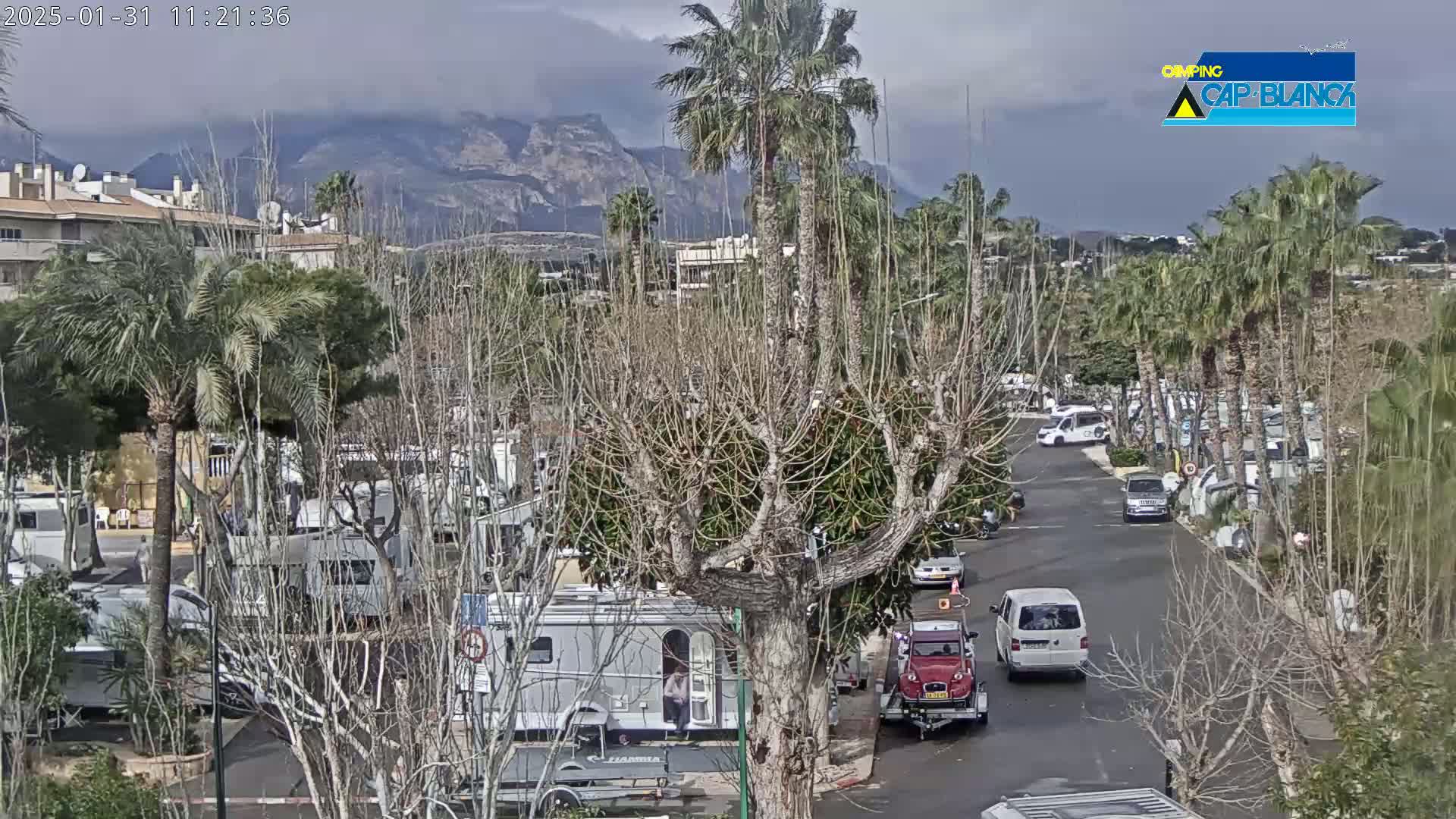 A partly cloudy day reveals a street lined with palm trees and recreational vehicles, with mountains visible in the background.