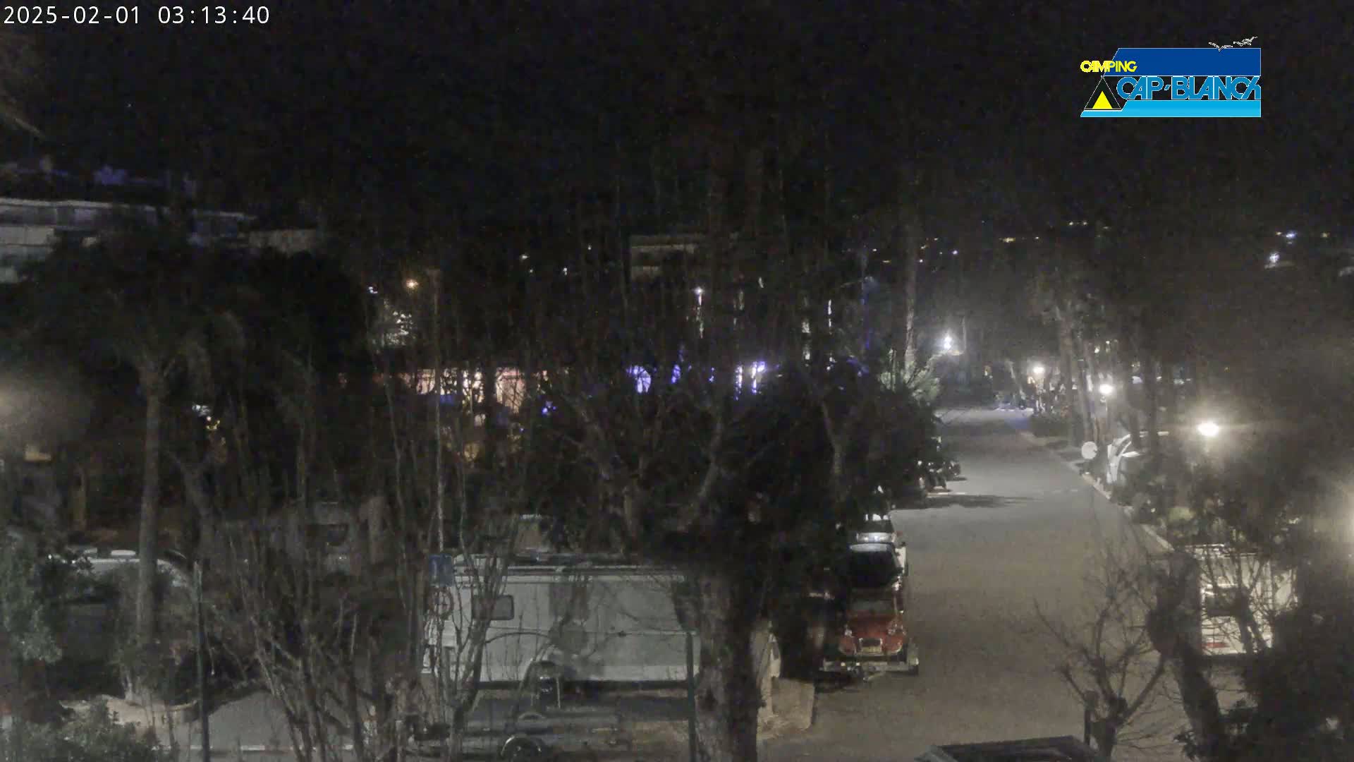 A nighttime street scene shows a road lined with trees and parked vehicles under artificial light.