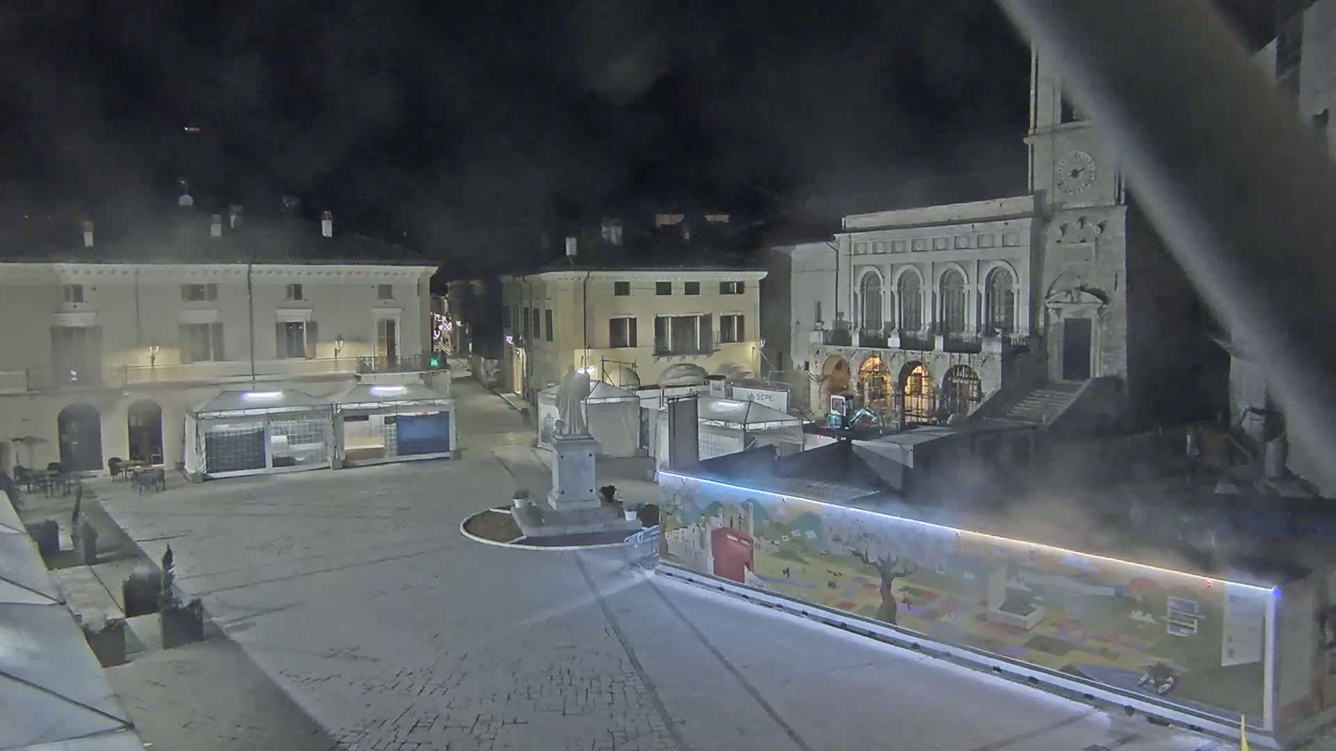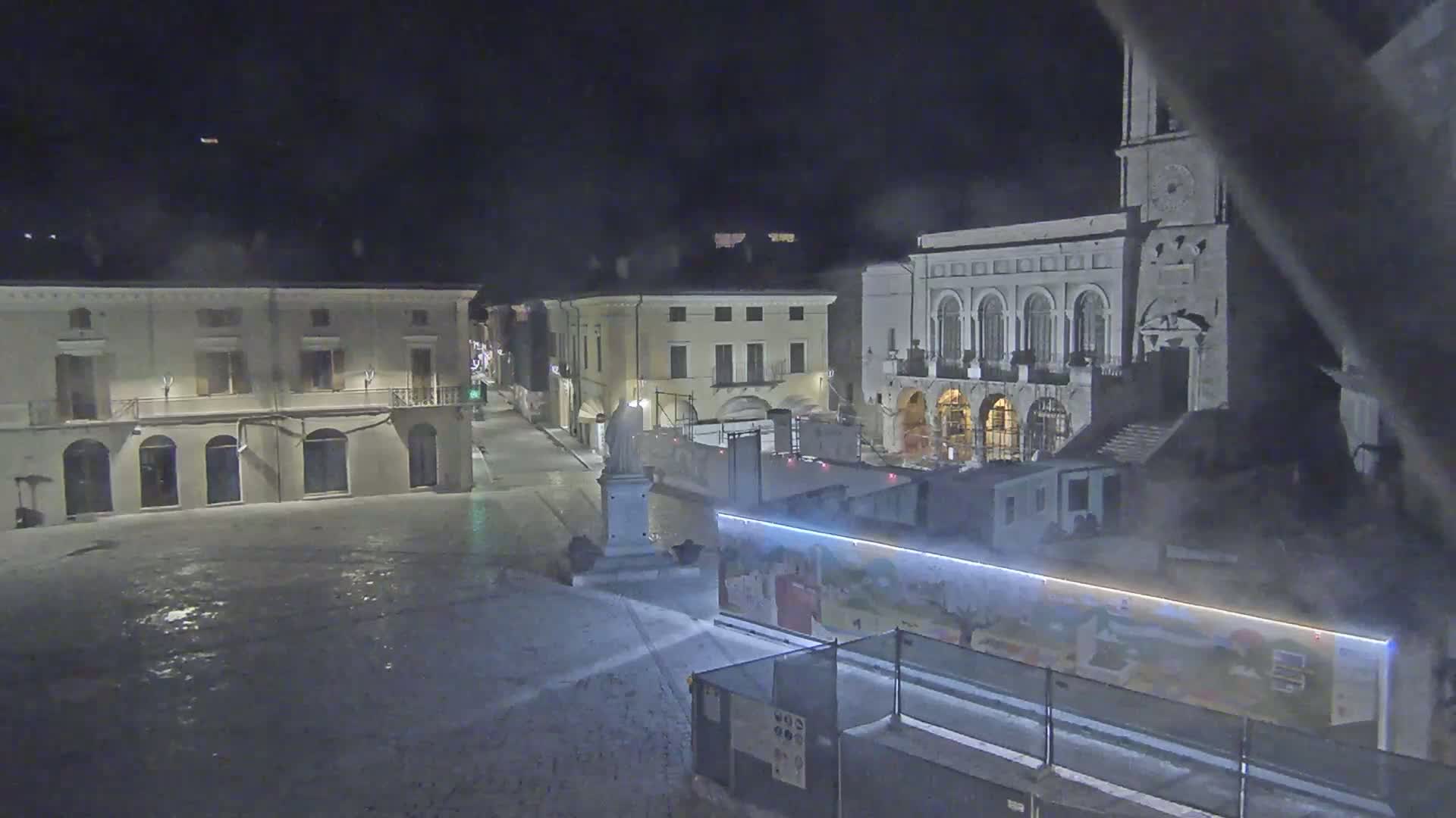 A nighttime view of a cobblestone town square with buildings, a statue, and construction barriers under dark, possibly overcast conditions.