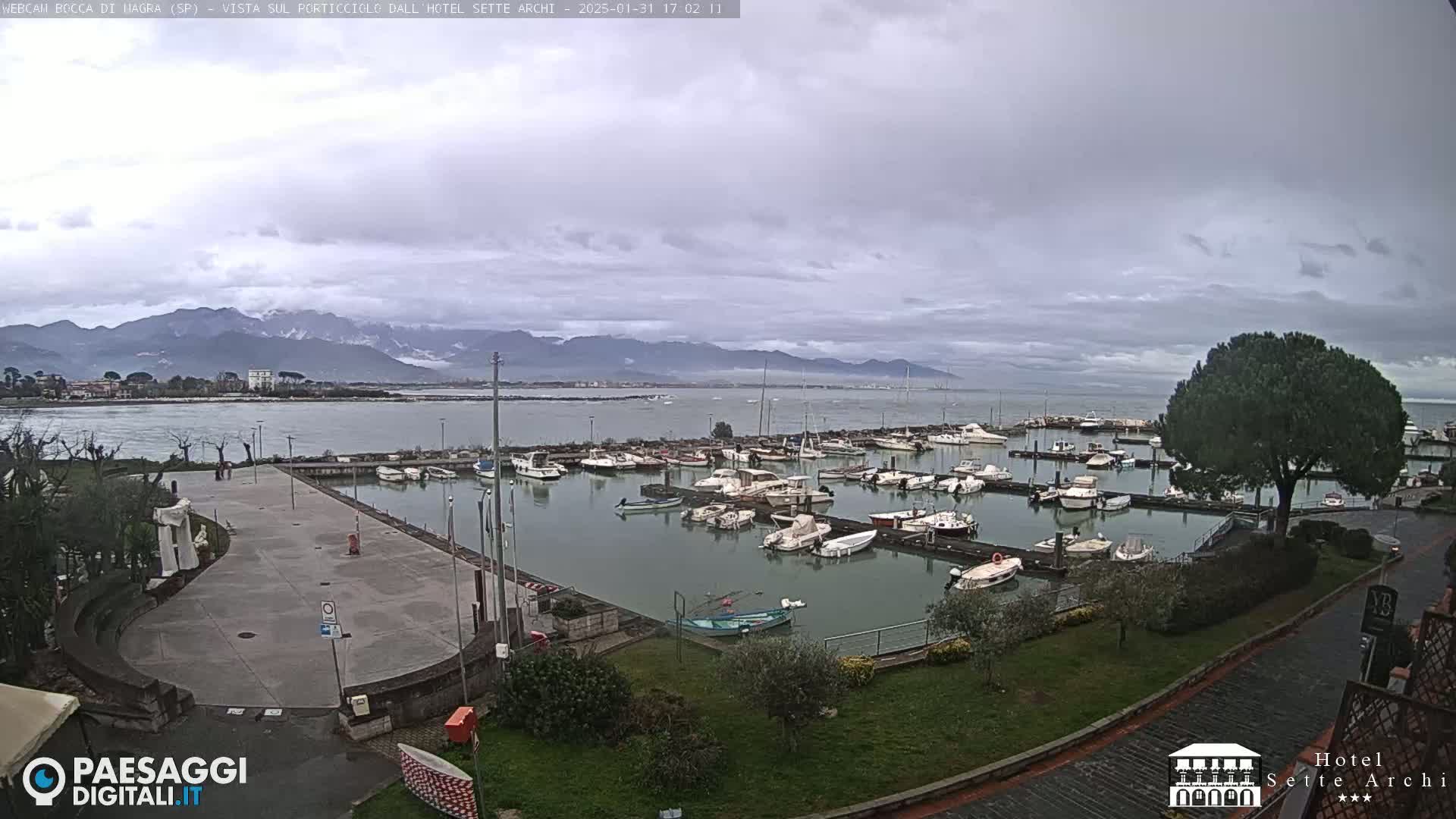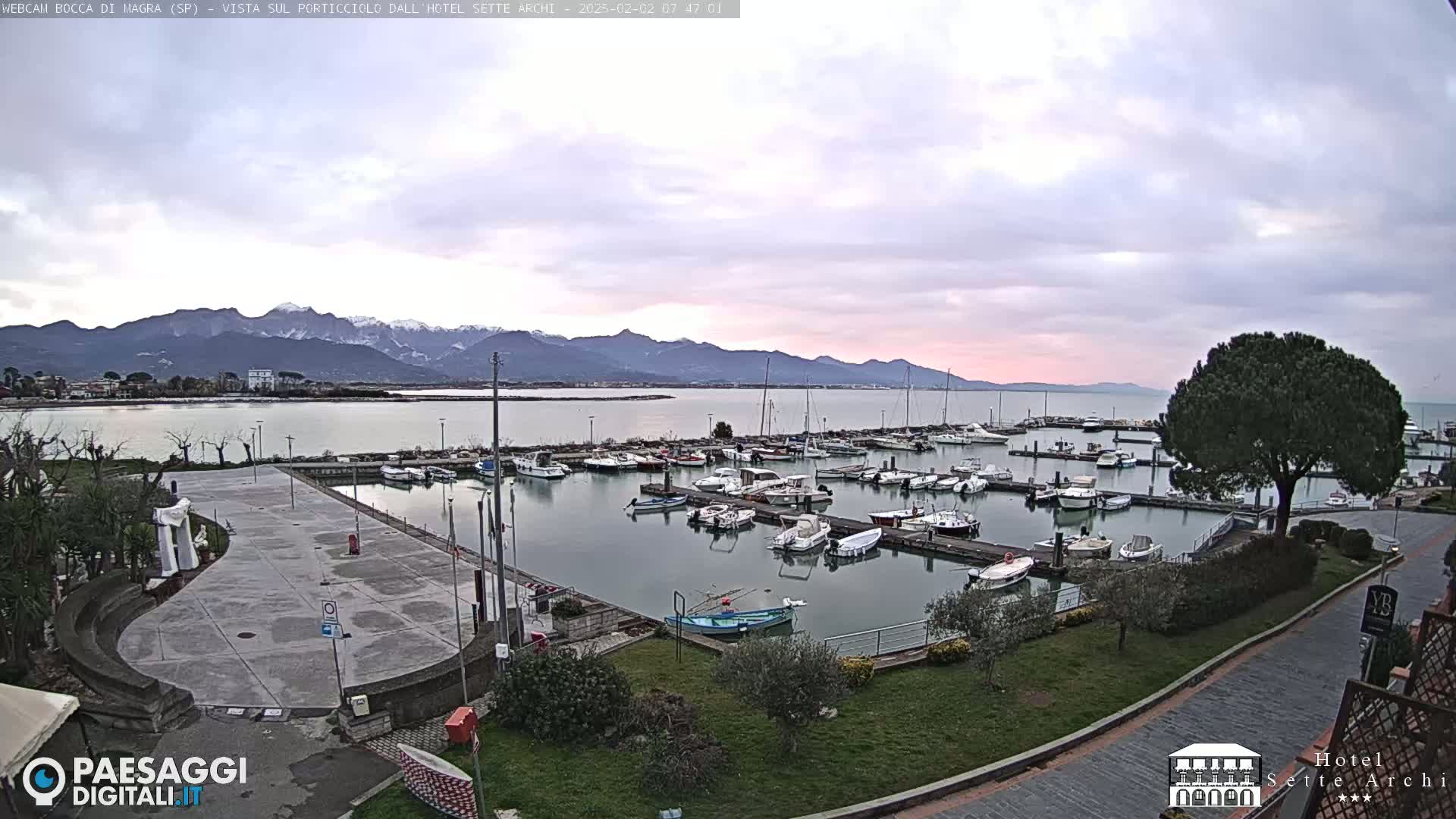A mostly cloudy evening scene shows a marina filled with numerous boats, a paved area, and a tree, all overlooking calm water with mountains in the distance.