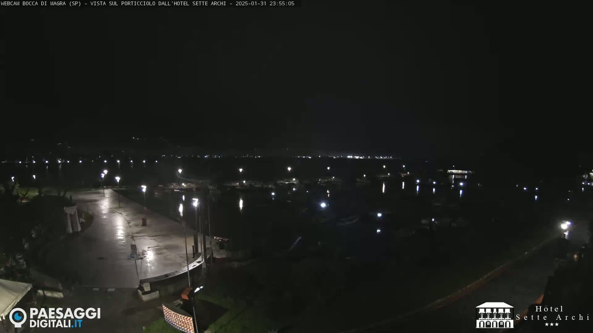 A nighttime view of a harbor with boats and a paved walkway, illuminated by lights, under a dark sky.