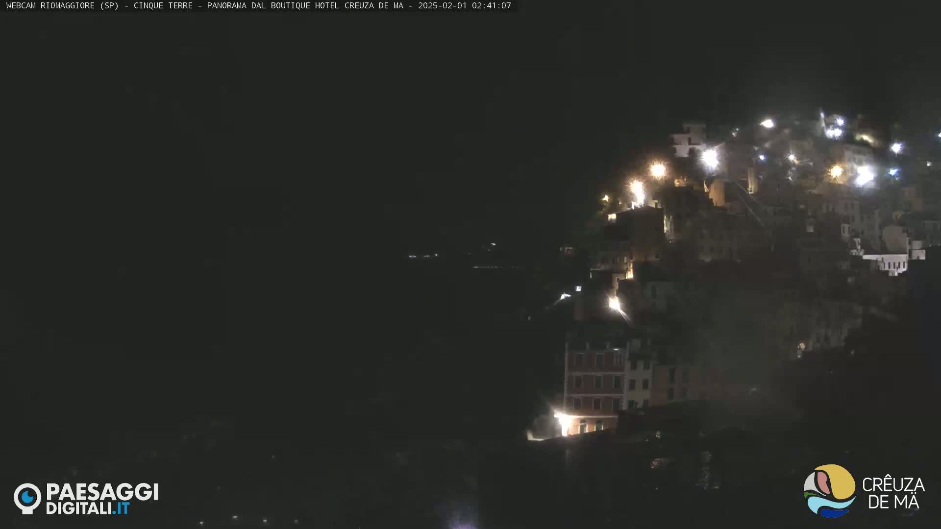 A nighttime view of a hillside village illuminated by lights, overlooking a dark body of water.