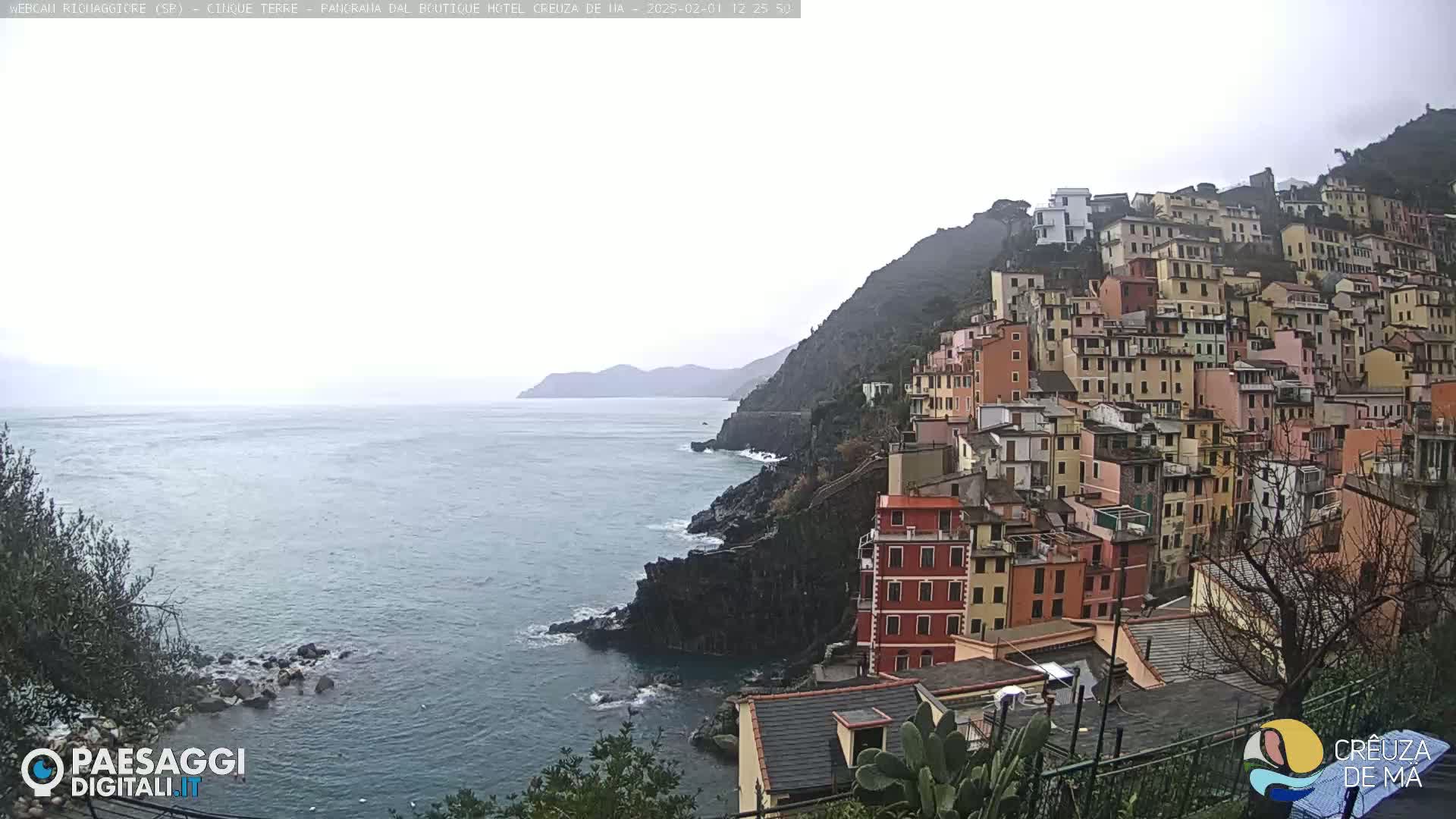 A coastal village of colorful buildings clings to a steep hillside overlooking a dark blue, choppy sea under a cloudy sky.