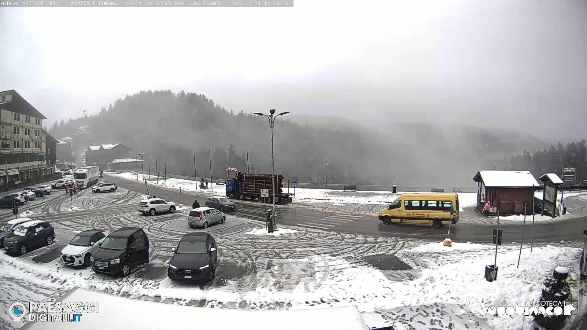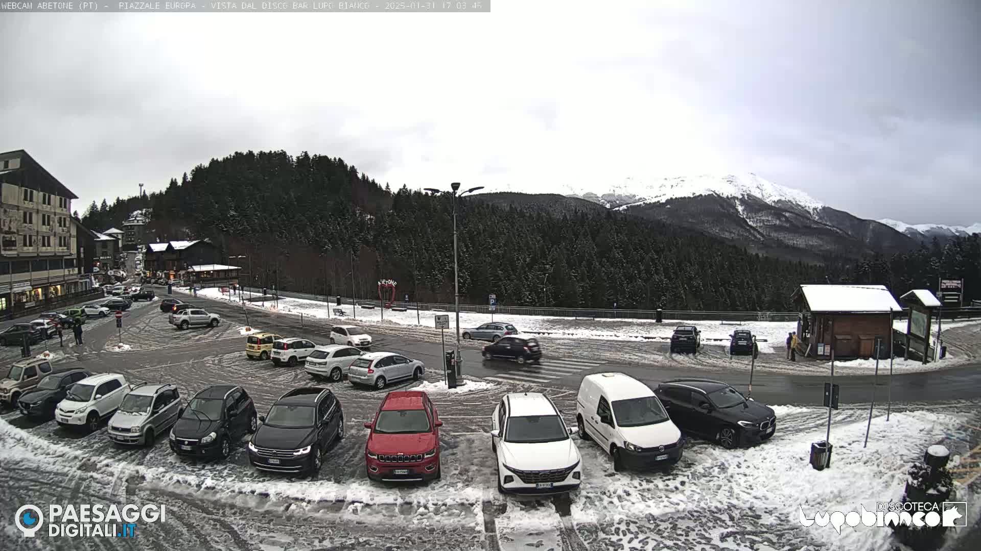 A sunny day reveals a parking lot filled with cars and vans, overlooking a mountainside covered in lush green trees and a few patches of snow.