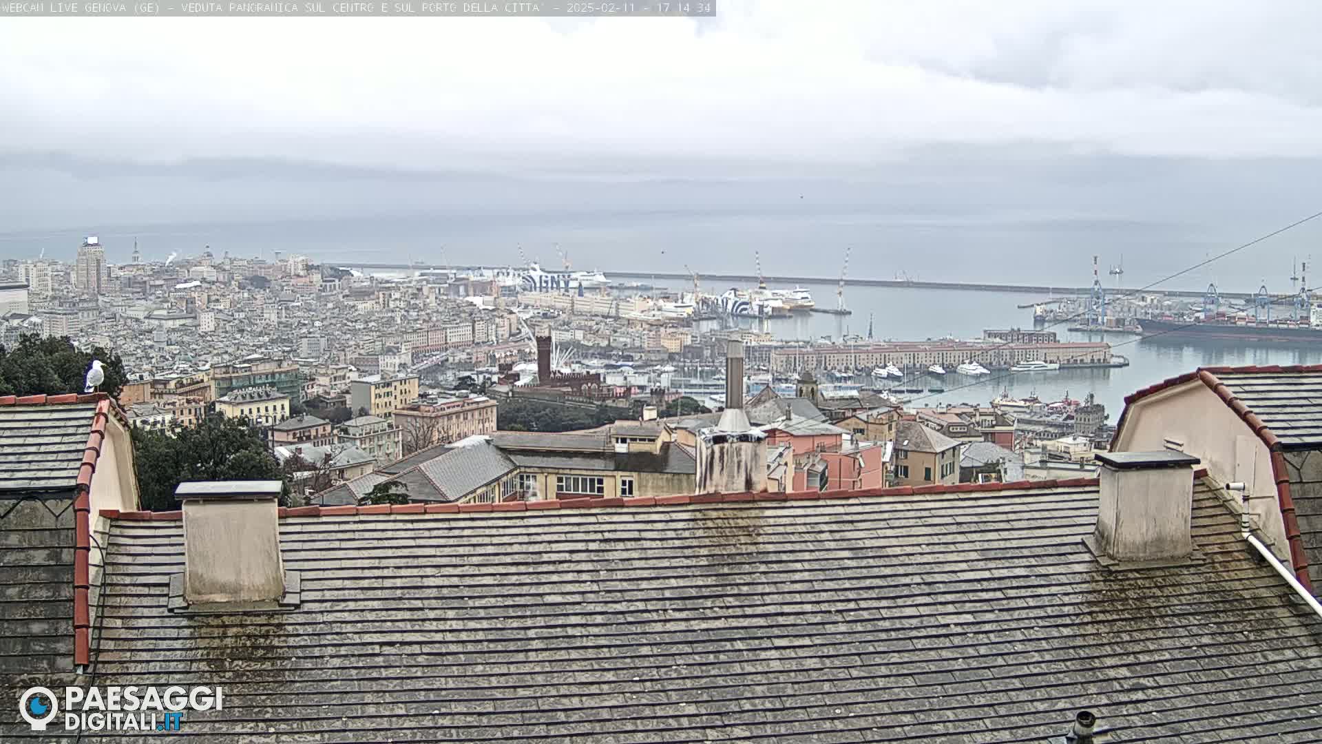 A wide shot of a city and harbor under an overcast sky, viewed from a rooftop with grey shingles.