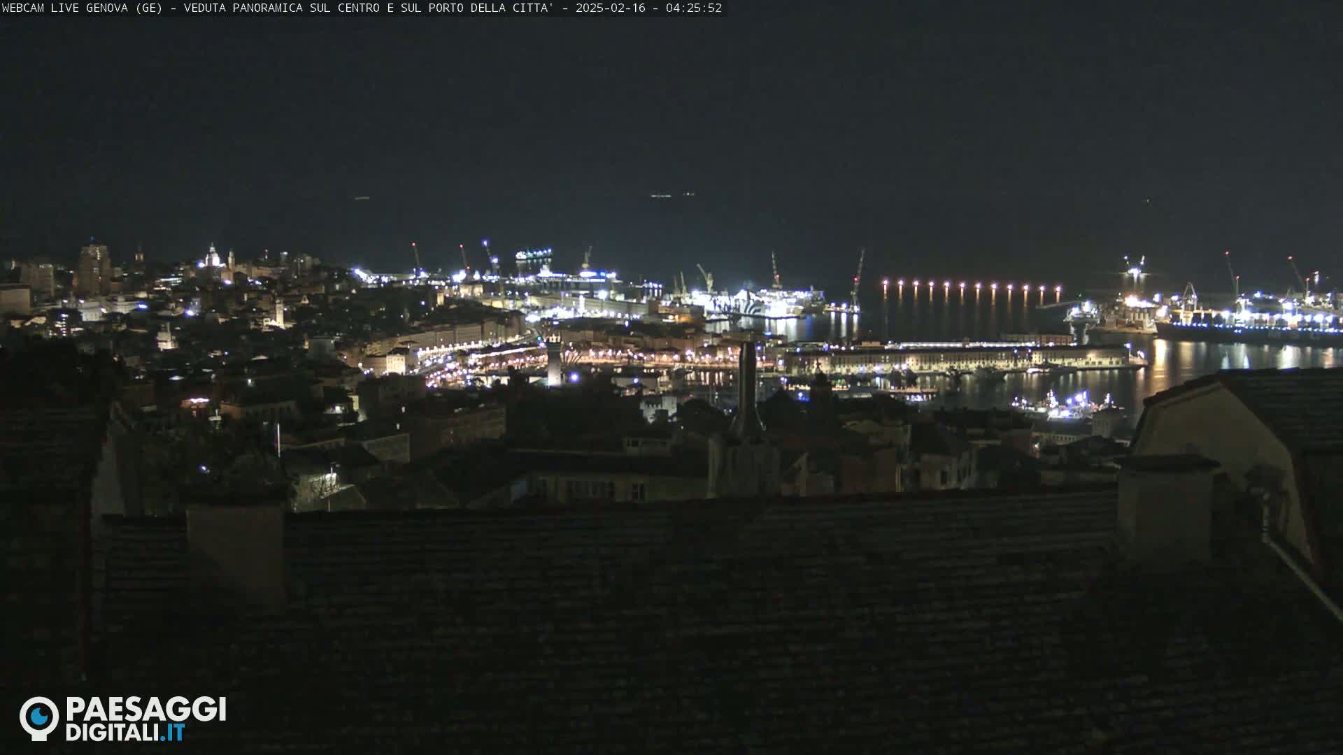 A nighttime, panoramic view of a city's harbor and cityscape, illuminated by lights, extends to a dark, calm sea.