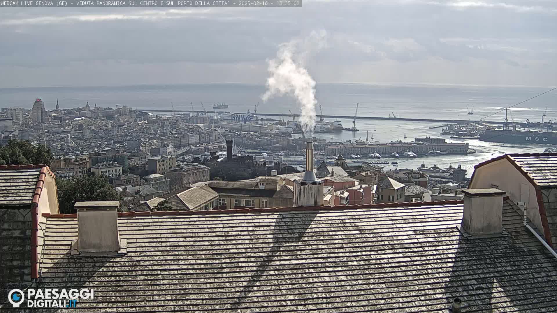 A panoramic view of a city and harbor on a sunny day, seen from a rooftop with a seagull perched on a chimney.