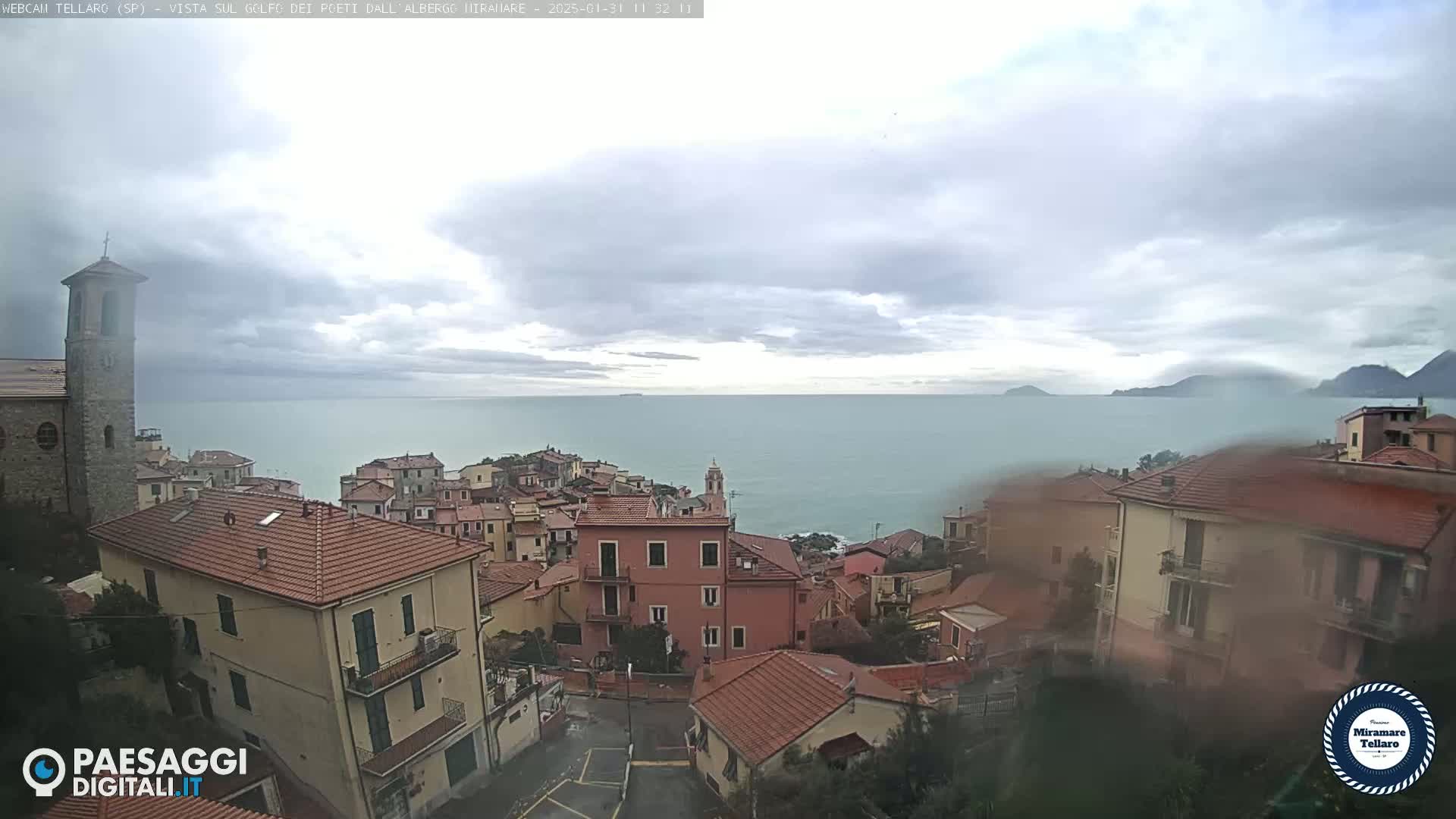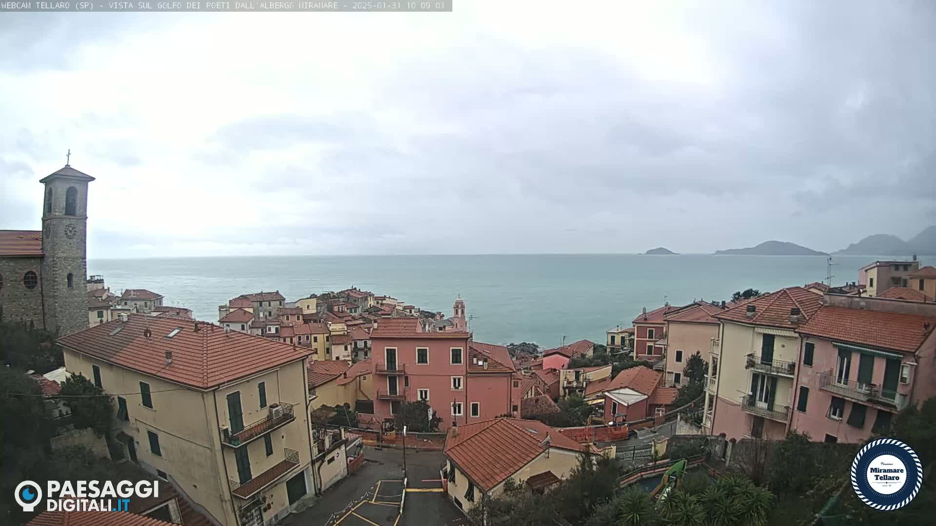 Overlooking a coastal town with red-tiled roofs and a church, a calm sea stretches to distant hills under a cloudy sky.