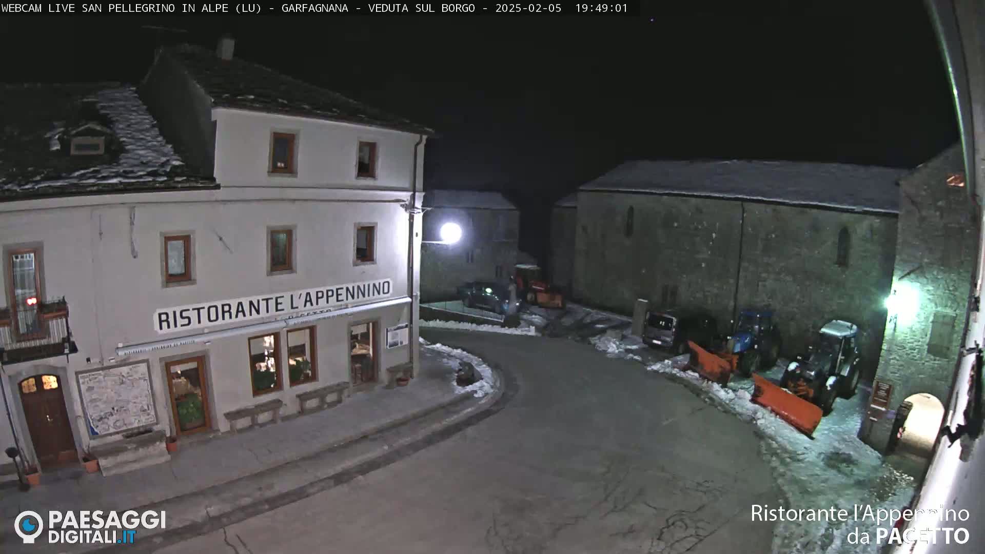 A foggy nighttime scene shows a restaurant called "Ristorante L'Appennino" and a small, light-colored vehicle parked nearby.