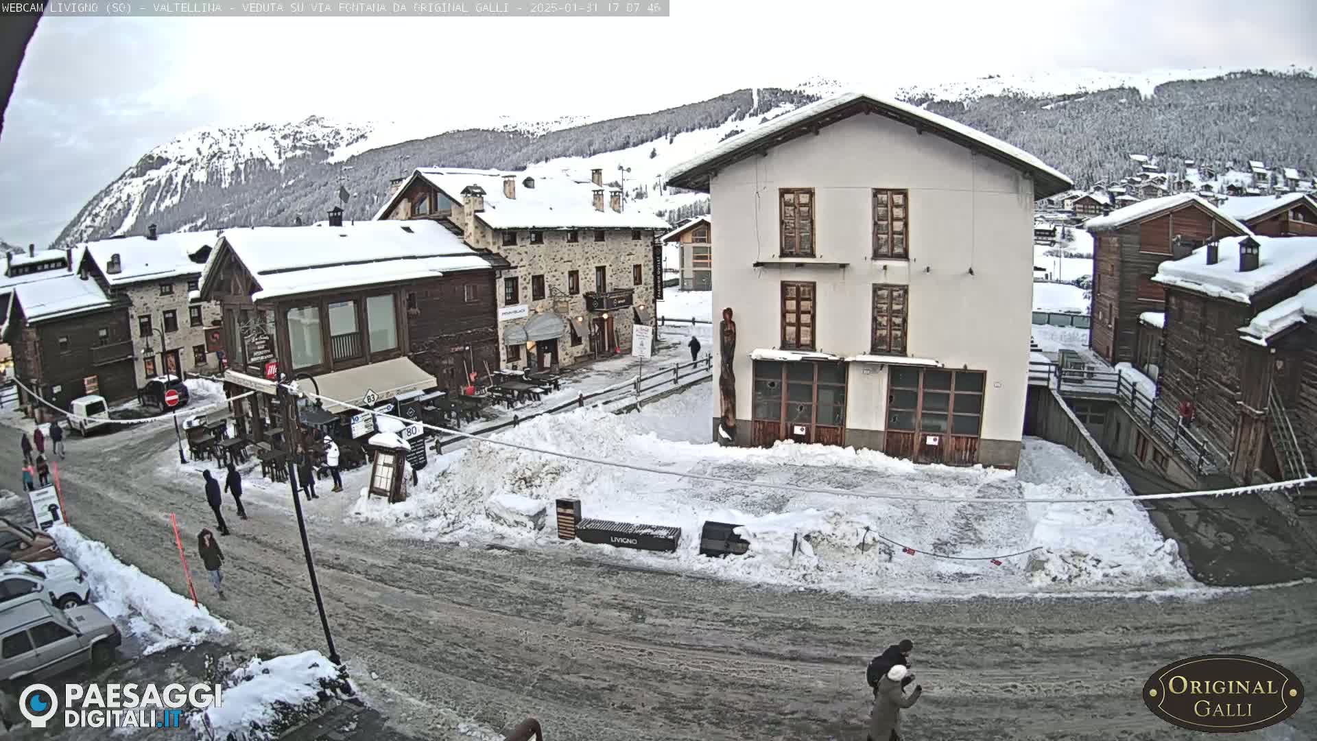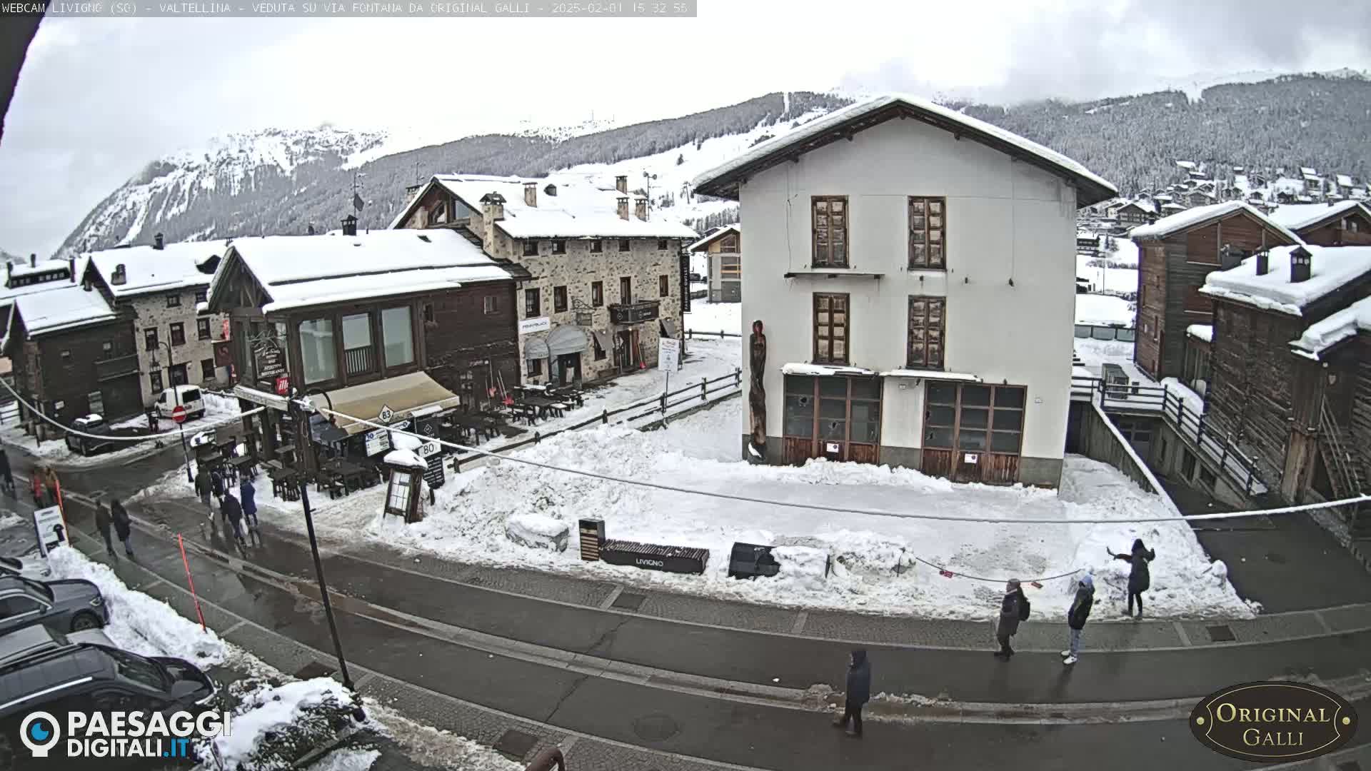 A mostly cloudy day in a village nestled in a mountain valley, showing a street scene with pedestrians, parked cars, and several buildings, including a restaurant with outdoor seating.