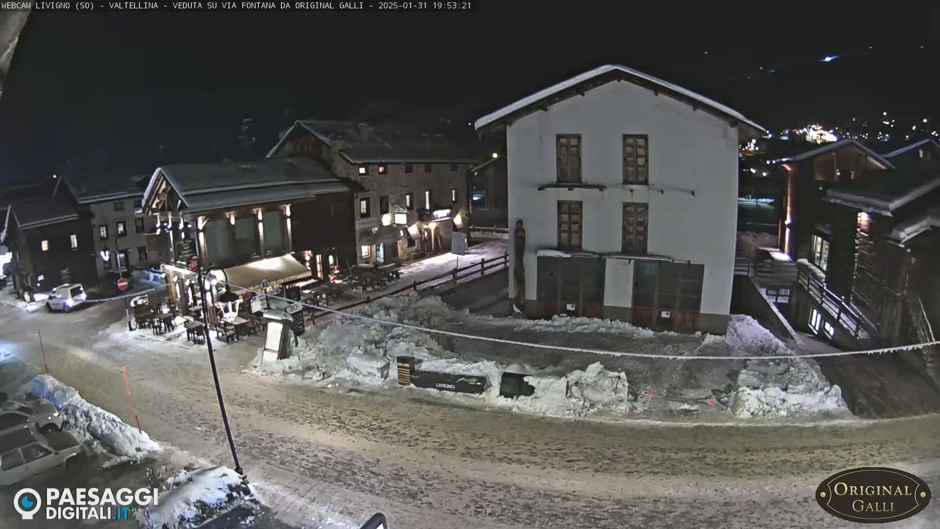 A mostly clear day reveals a village square in a mountainous region with several stone and wood buildings, some with outdoor seating, and a few cars parked nearby; there is some snow on the ground.