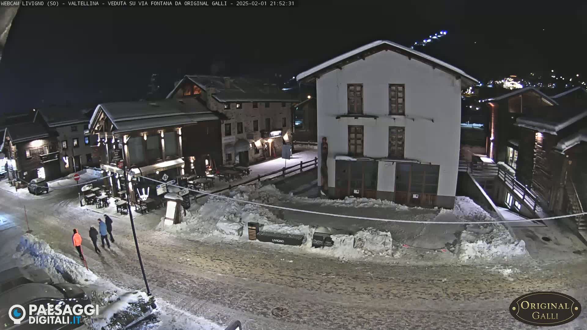 A nighttime street scene shows several people walking on a paved road past buildings, with some snow patches visible on the ground.