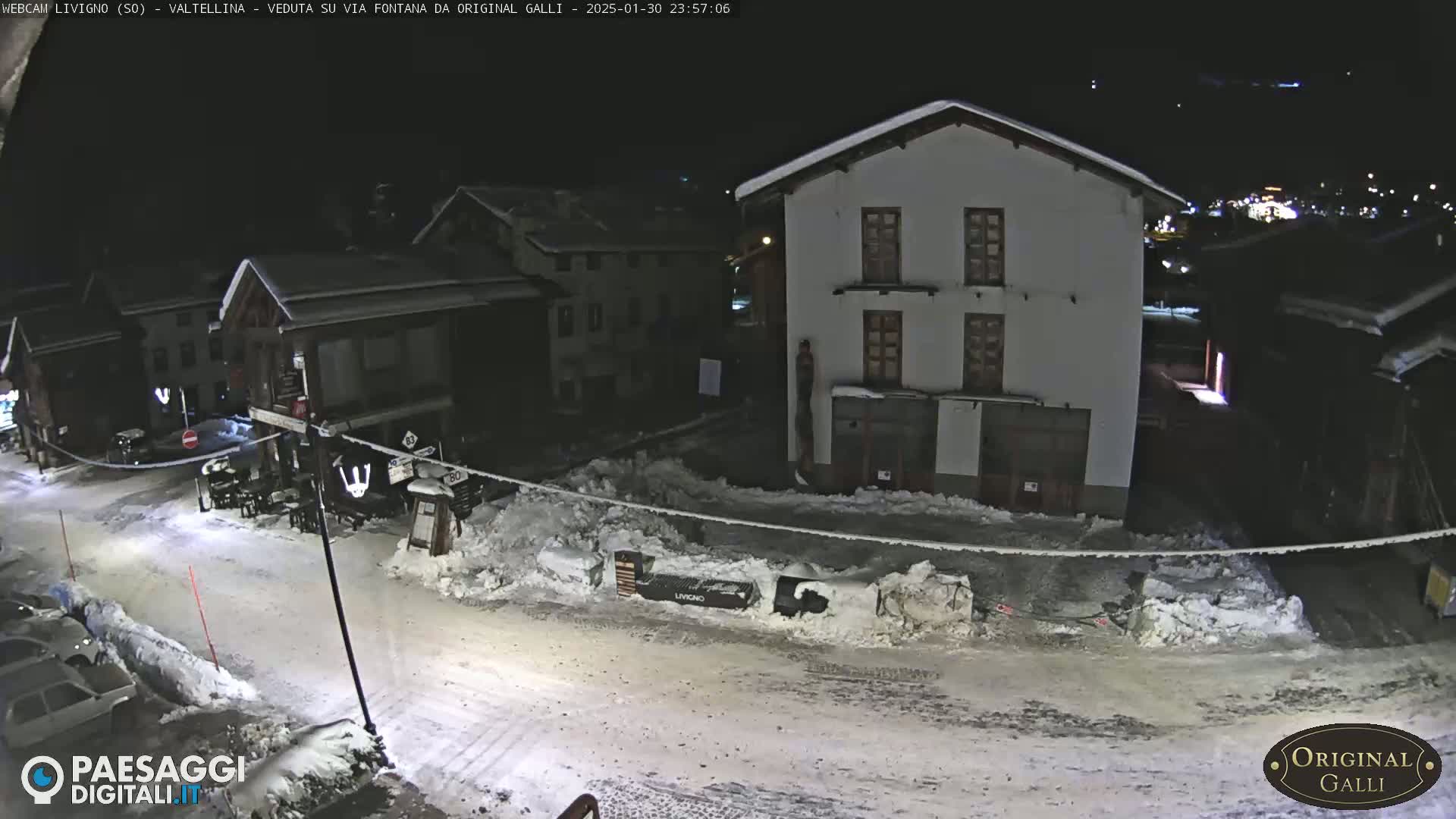 A nighttime, snow-dusted street scene shows a two-story building and a road with a few parked cars.