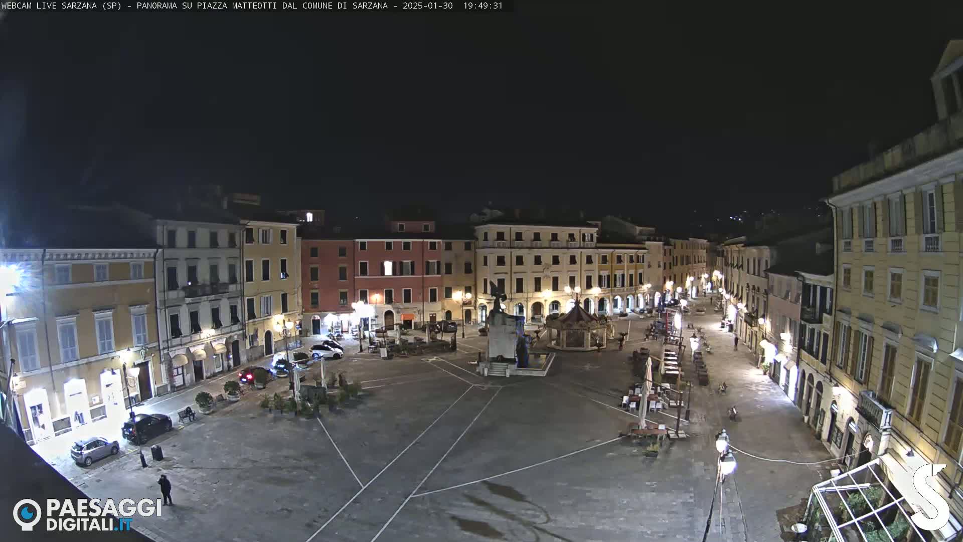 A nighttime, high-angle view of a mostly empty town square surrounded by buildings, with a few cars and some outdoor seating visible.