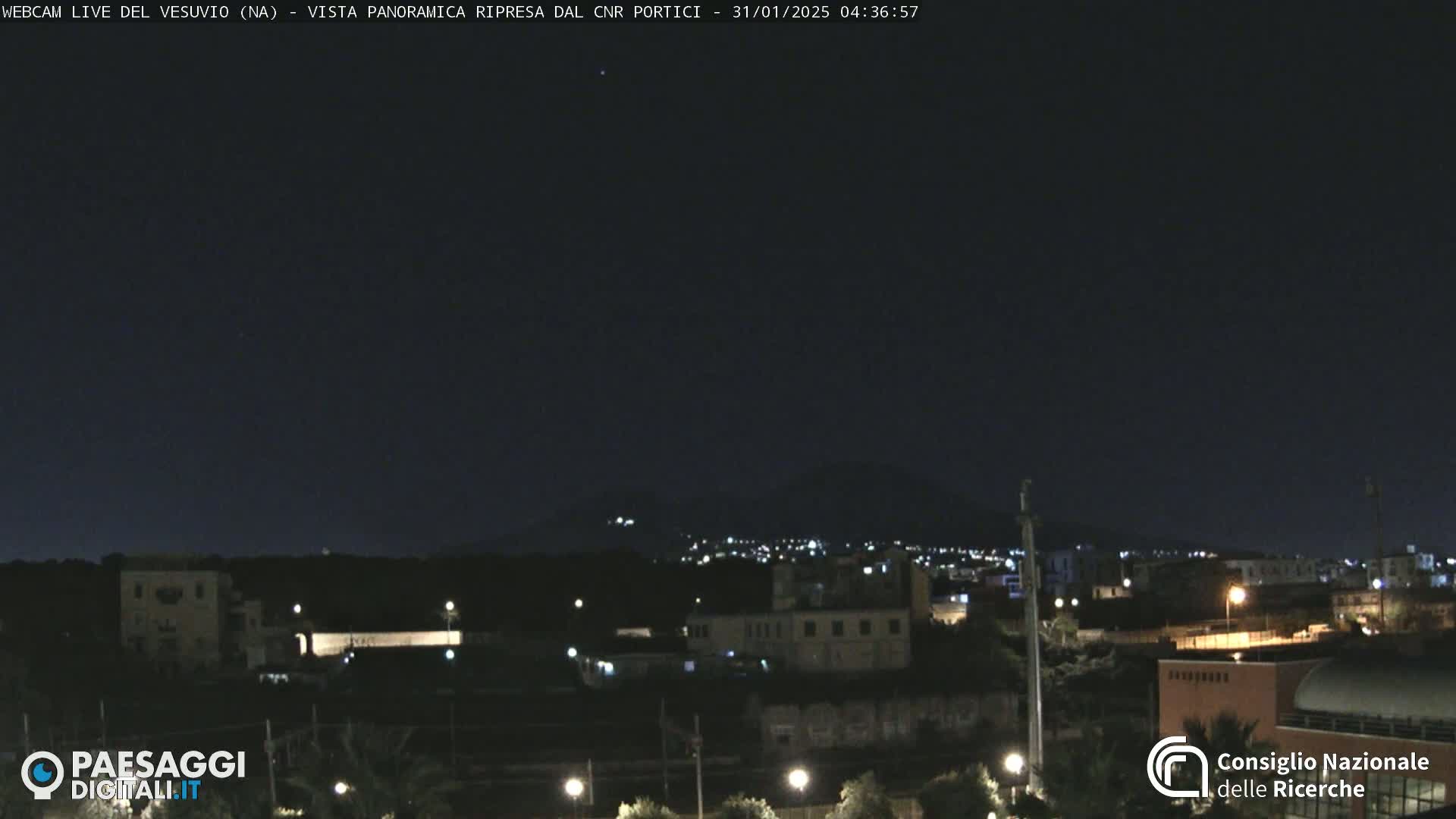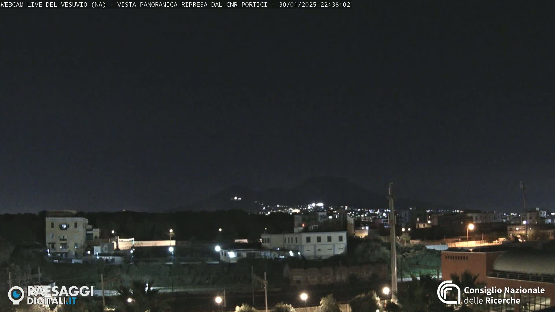 A twilight view shows a city under a partly cloudy sky with Mount Vesuvius in the background.