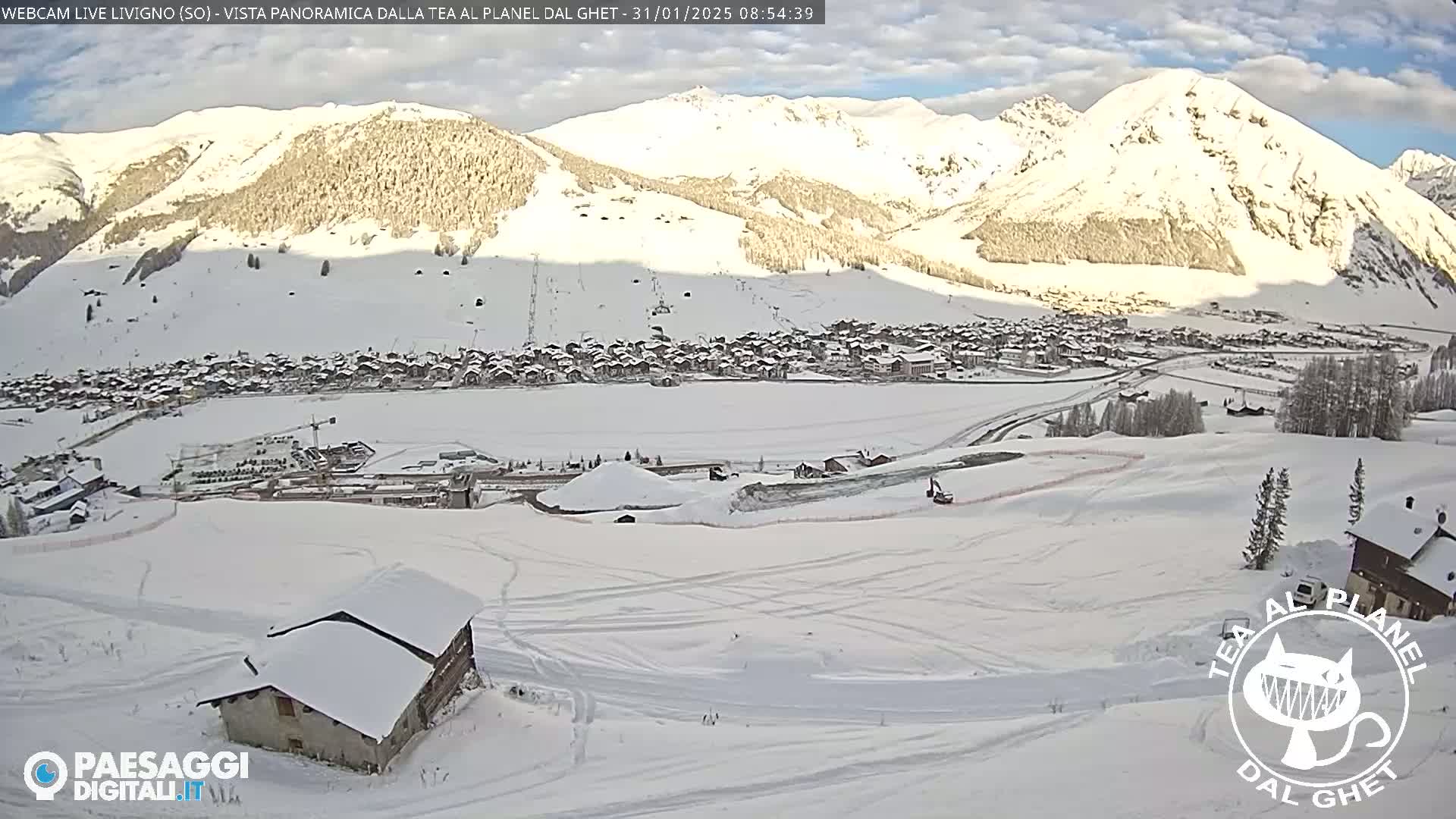 A sunny day reveals a village nestled in a valley, with snow-dusted mountains in the background and construction visible in the foreground.