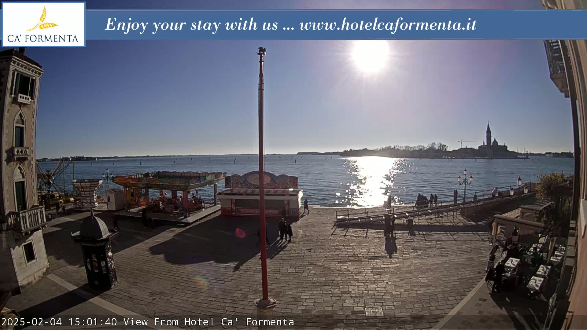 A sunny day in Venice shows a waterfront plaza with a large cruise ship and distant island, a flagpole with a red and gold flag, and a few people walking around.