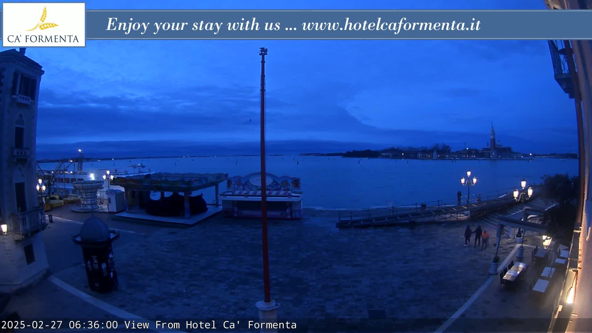 A nighttime view of a waterfront plaza shows a flag waving in the breeze, a few people walking, and a body of water with lights across it.