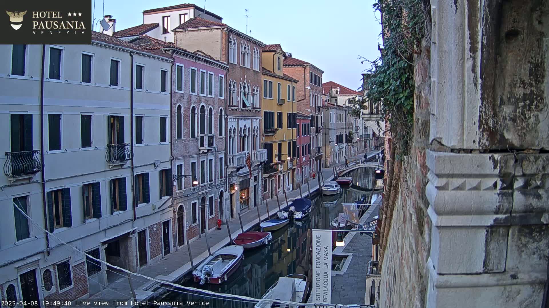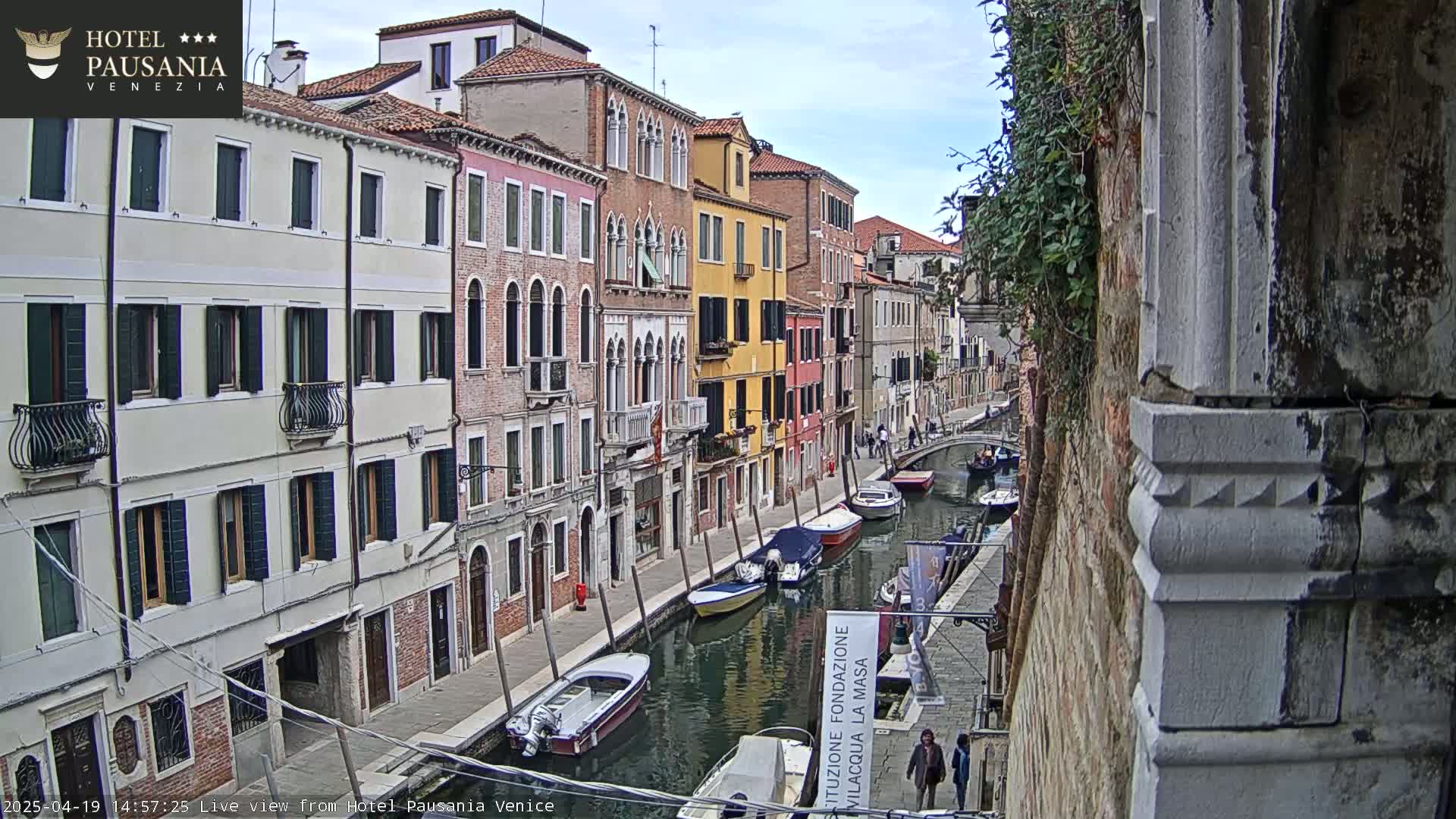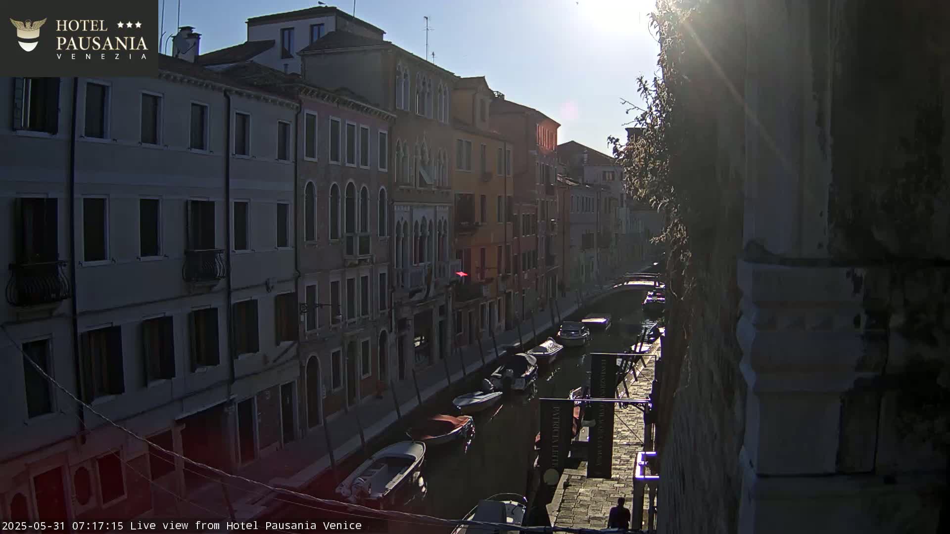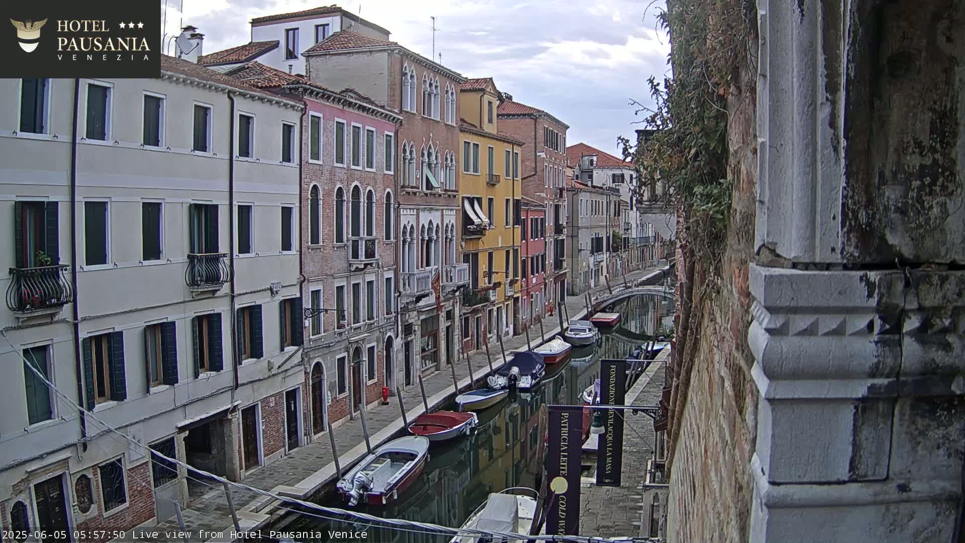 A sunny day in Venice shows a narrow canal lined with colorful buildings and several moored boats.