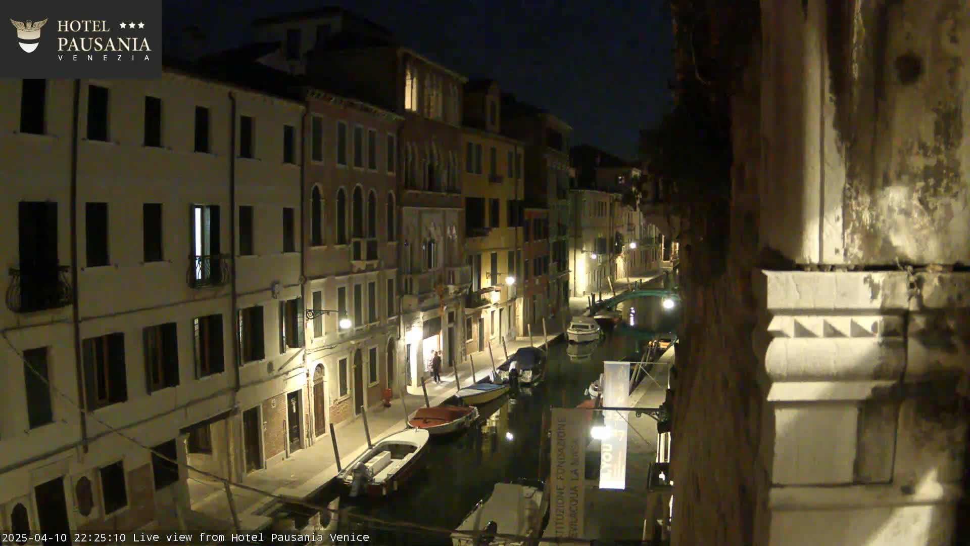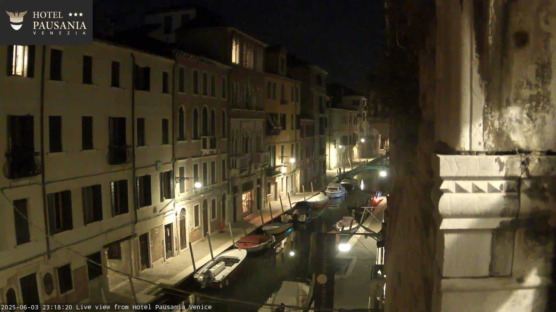 The image shows a clear, dark night scene of a narrow canal in Venice, lined with illuminated historic buildings and moored boats, with a small arched bridge visible in the distance.