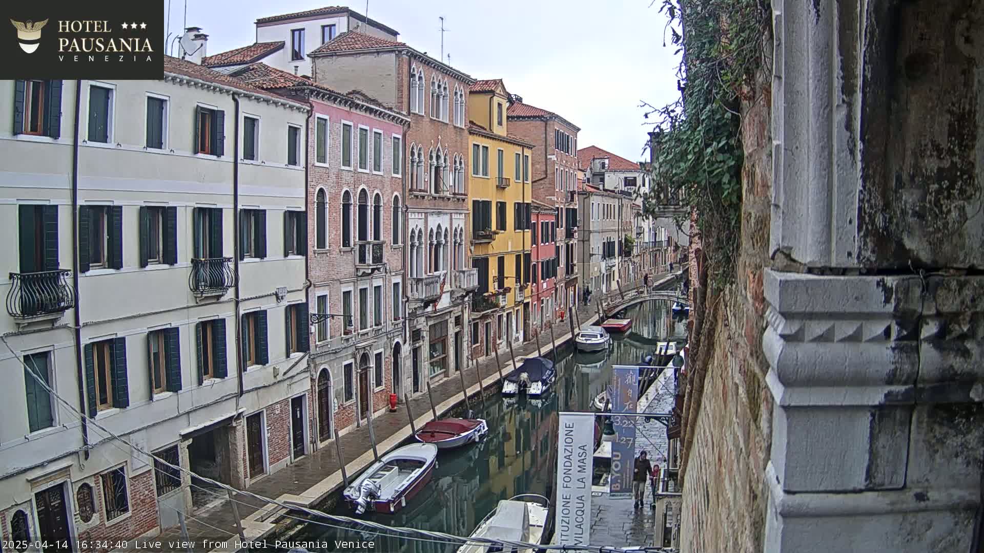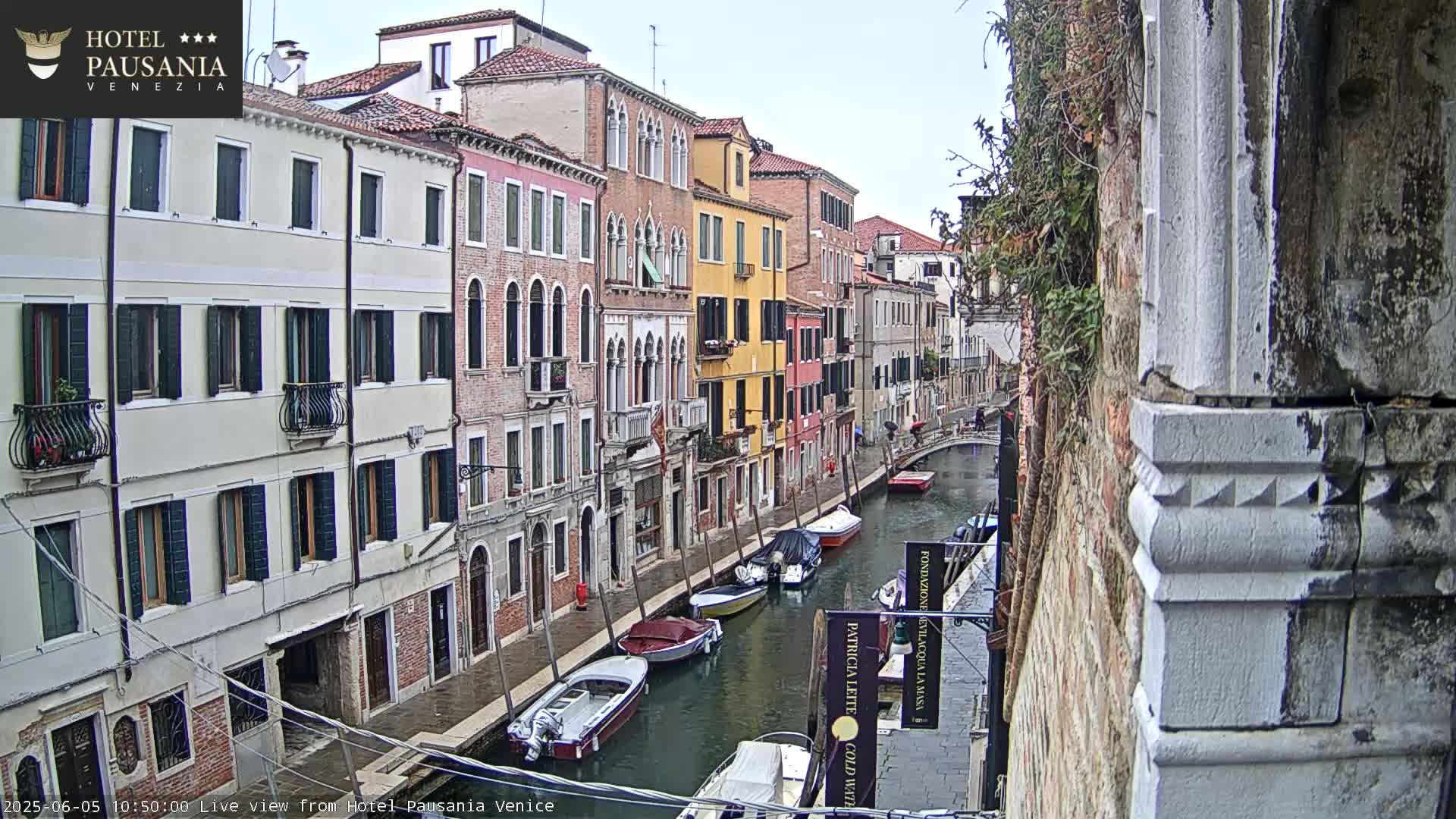 A tranquil Venetian canal is lined with a colorful array of historic buildings, featuring numerous moored boats and a distant arched bridge, all under an overcast sky.