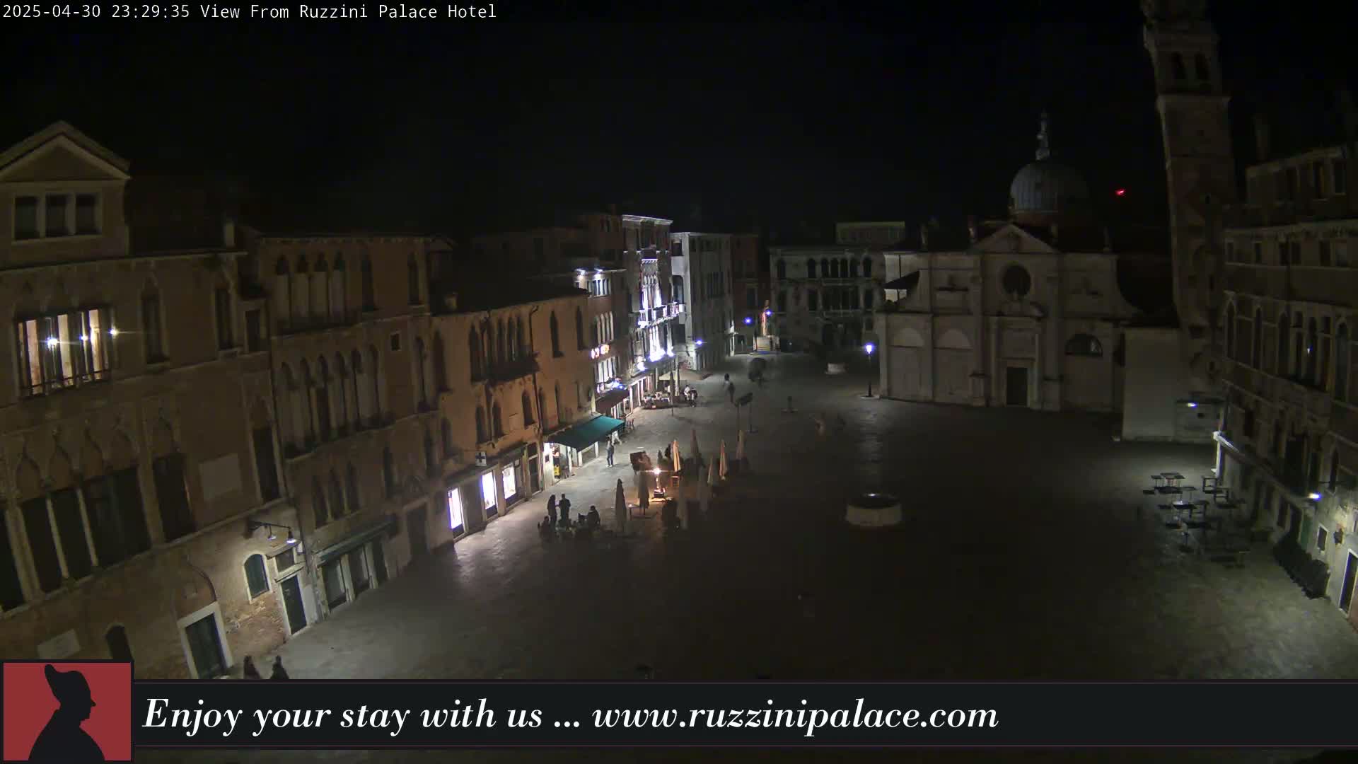 A high-angle, long shot of a large, paved town square in the evening, surrounded by several-story buildings under a clear sky, shows people sitting at outdoor cafes and walking about.