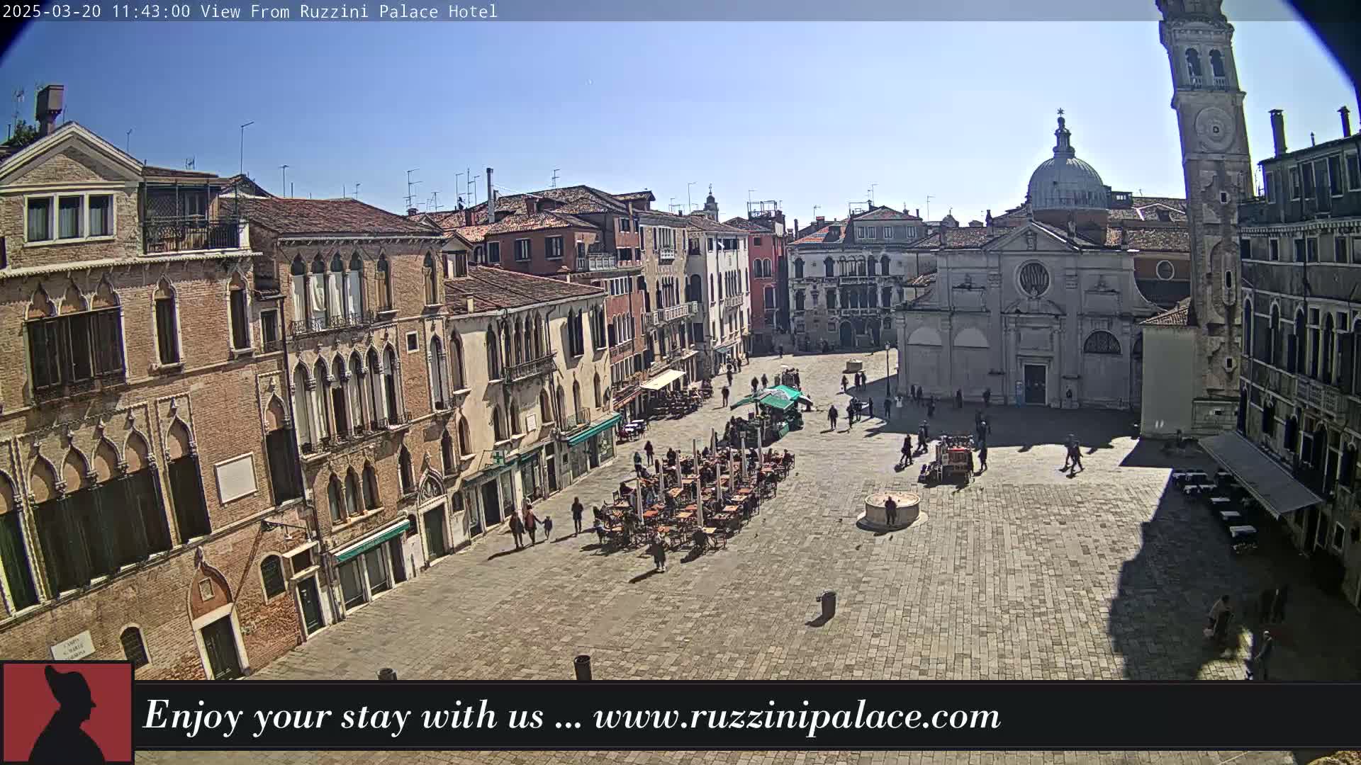 A sunny Venetian plaza, surrounded by historic buildings, features a few people and outdoor seating under umbrellas.