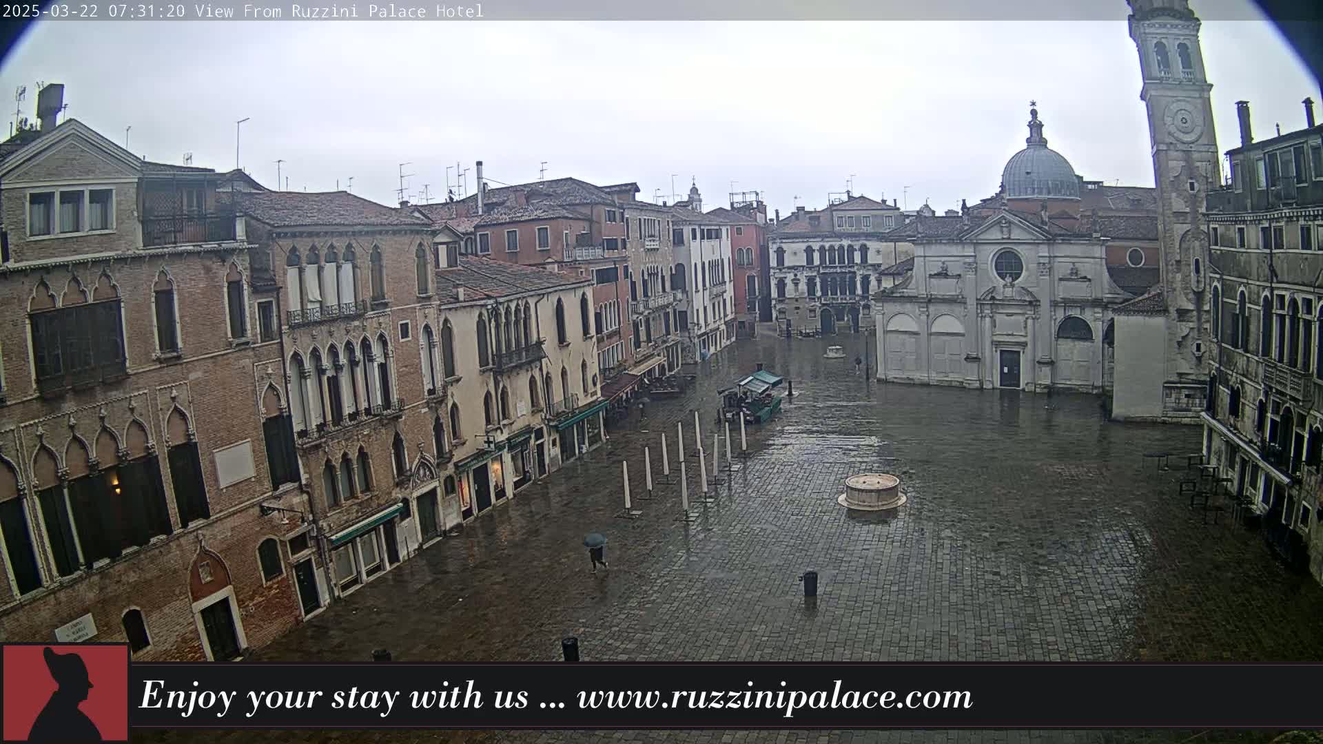 An overcast outdoor scene shows a large town square in Venice, Italy, surrounded by several-story brick buildings, with a church and clock tower visible, and people scattered throughout the square.