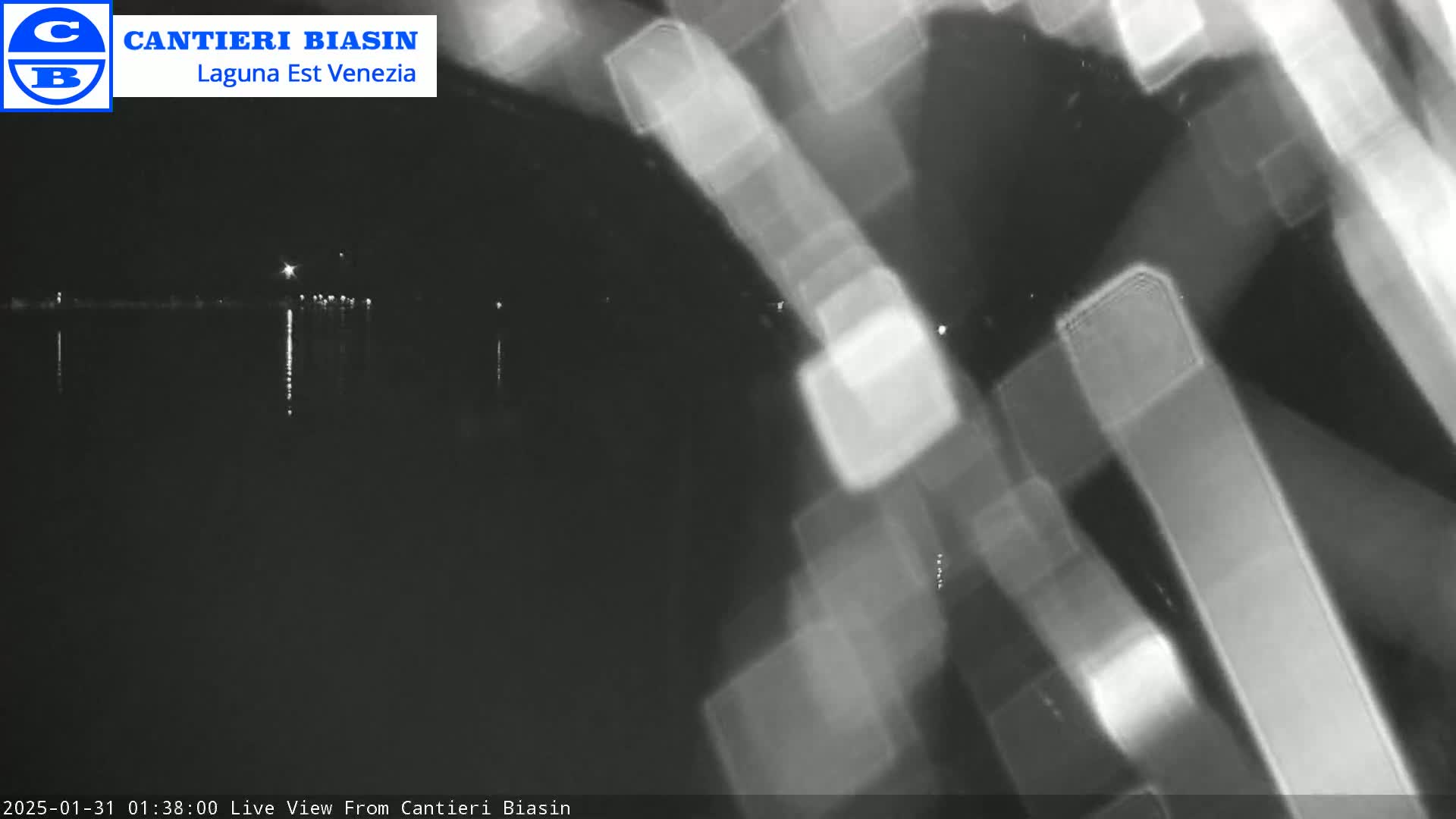 A nighttime, low-light view shows a dark body of water reflecting distant lights, with some posts or pilings visible in the foreground.