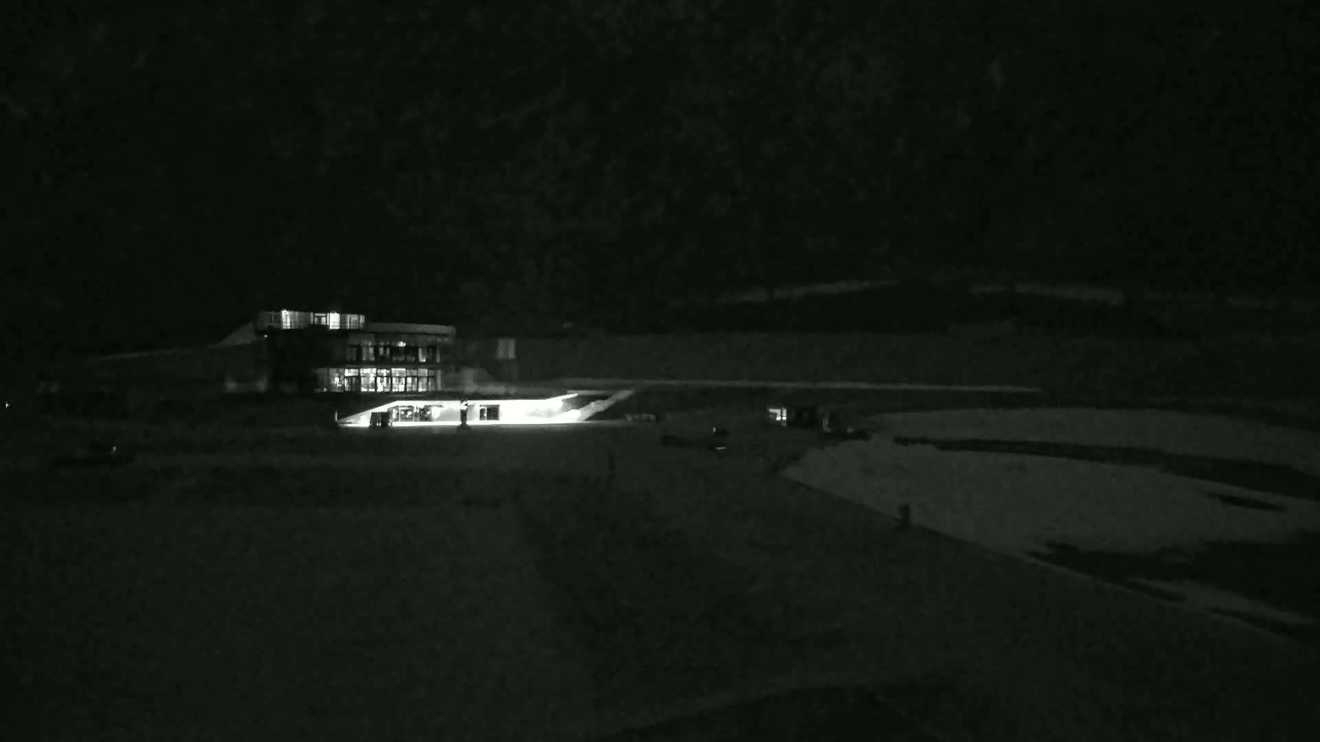 A very dark and blurry grayscale image taken at night reveals a distant building with glowing windows and a bright horizontal light source at its base.