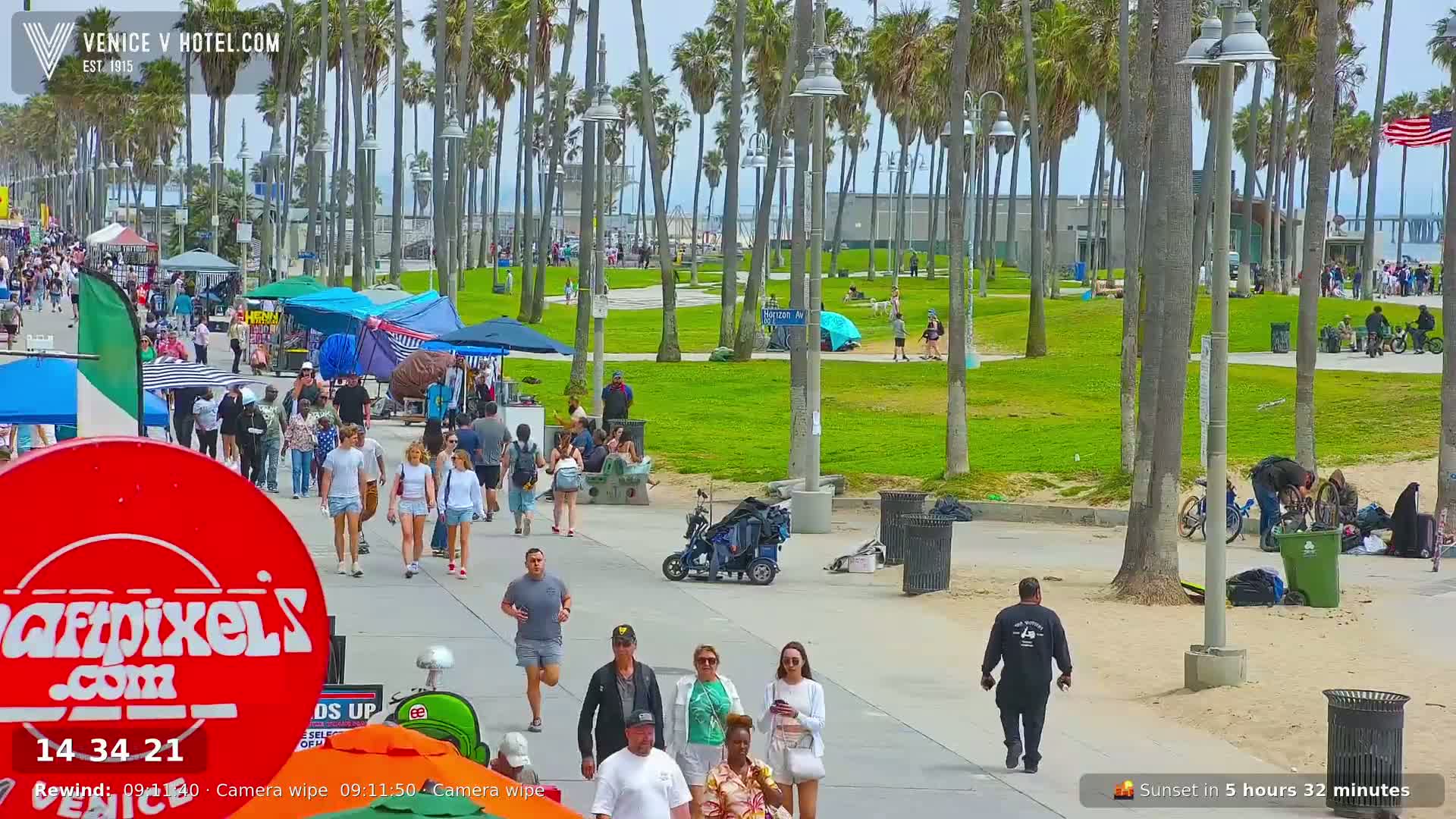 A long, brightly lit boardwalk runs alongside a dark beach and grassy area under a clear night sky, with streetlights extending into the distance and a building bordering the right.