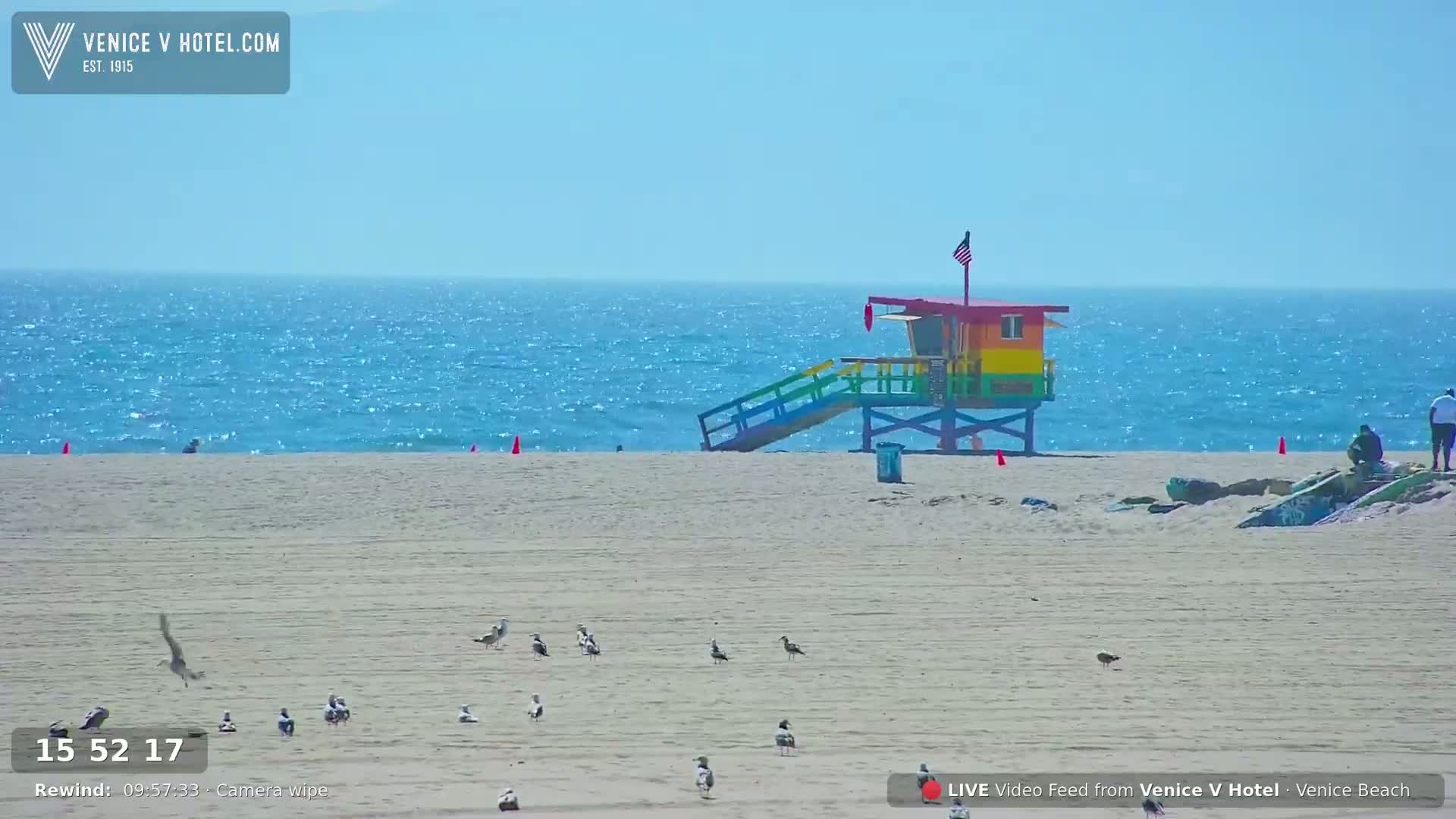 A sunny beach boardwalk scene shows numerous people walking past various vendors and temporary shops under a clear sky.