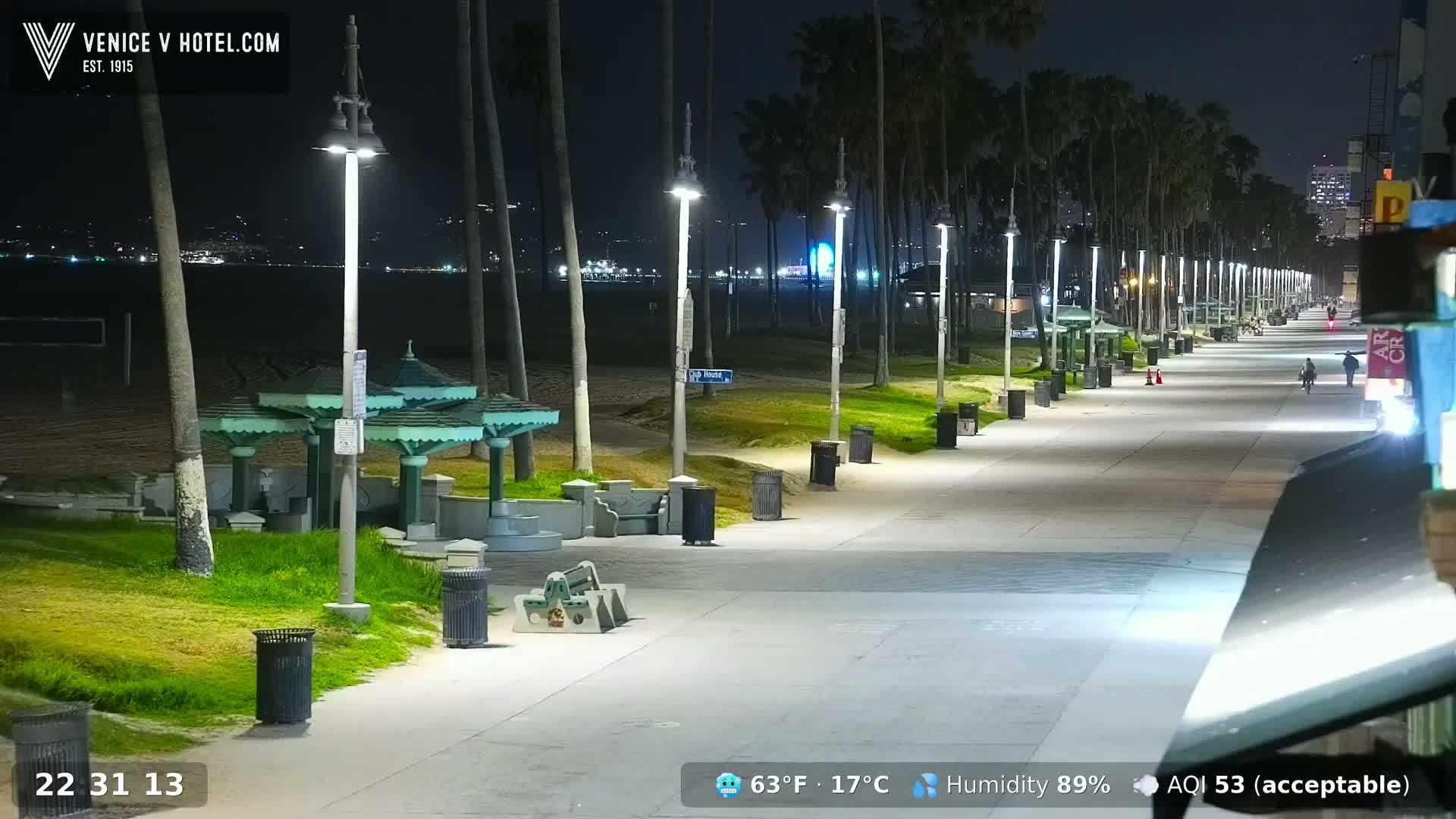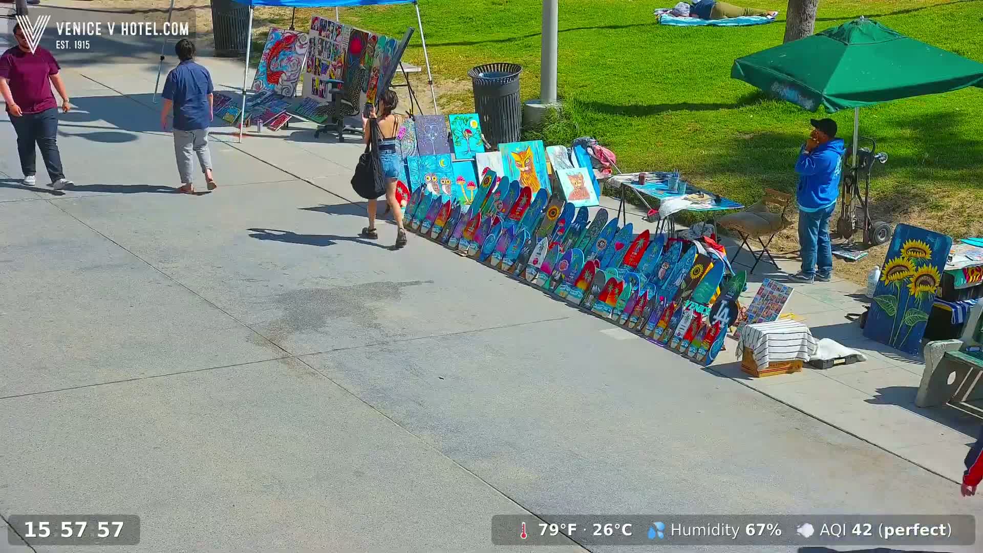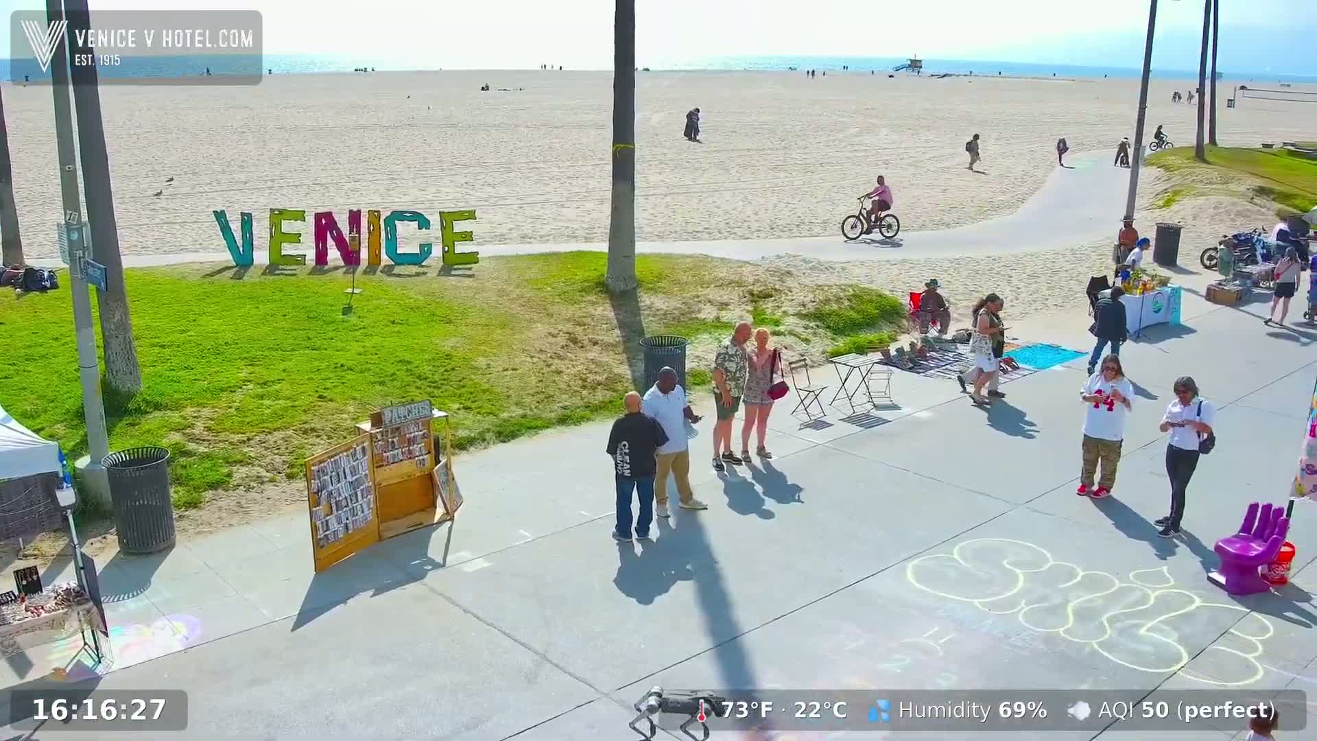 A sunny beach boardwalk scene shows several vendors' booths and people walking past chalk art on the pavement, near a sandy beach and ocean.