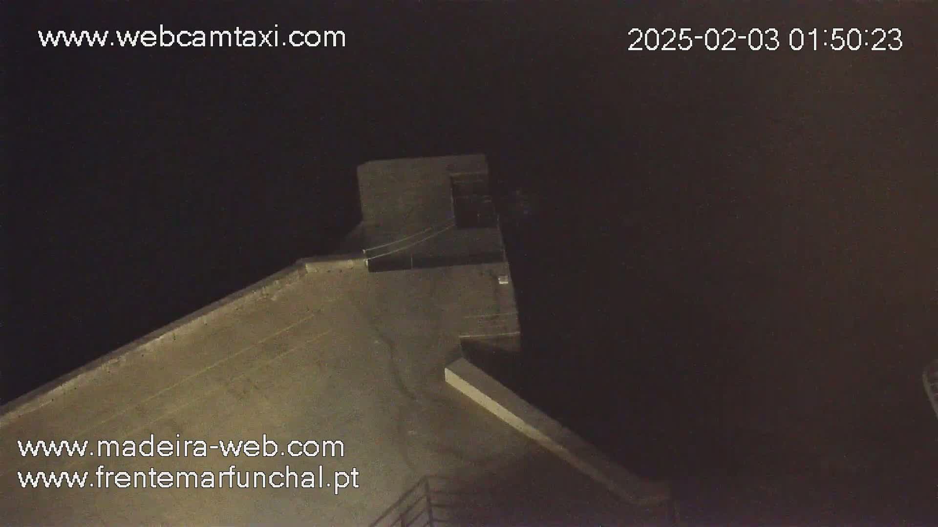 A nighttime, low-angle view shows a section of a dark gray concrete structure, possibly a wall or pier, with faint white splashes possibly from water visible in the background.